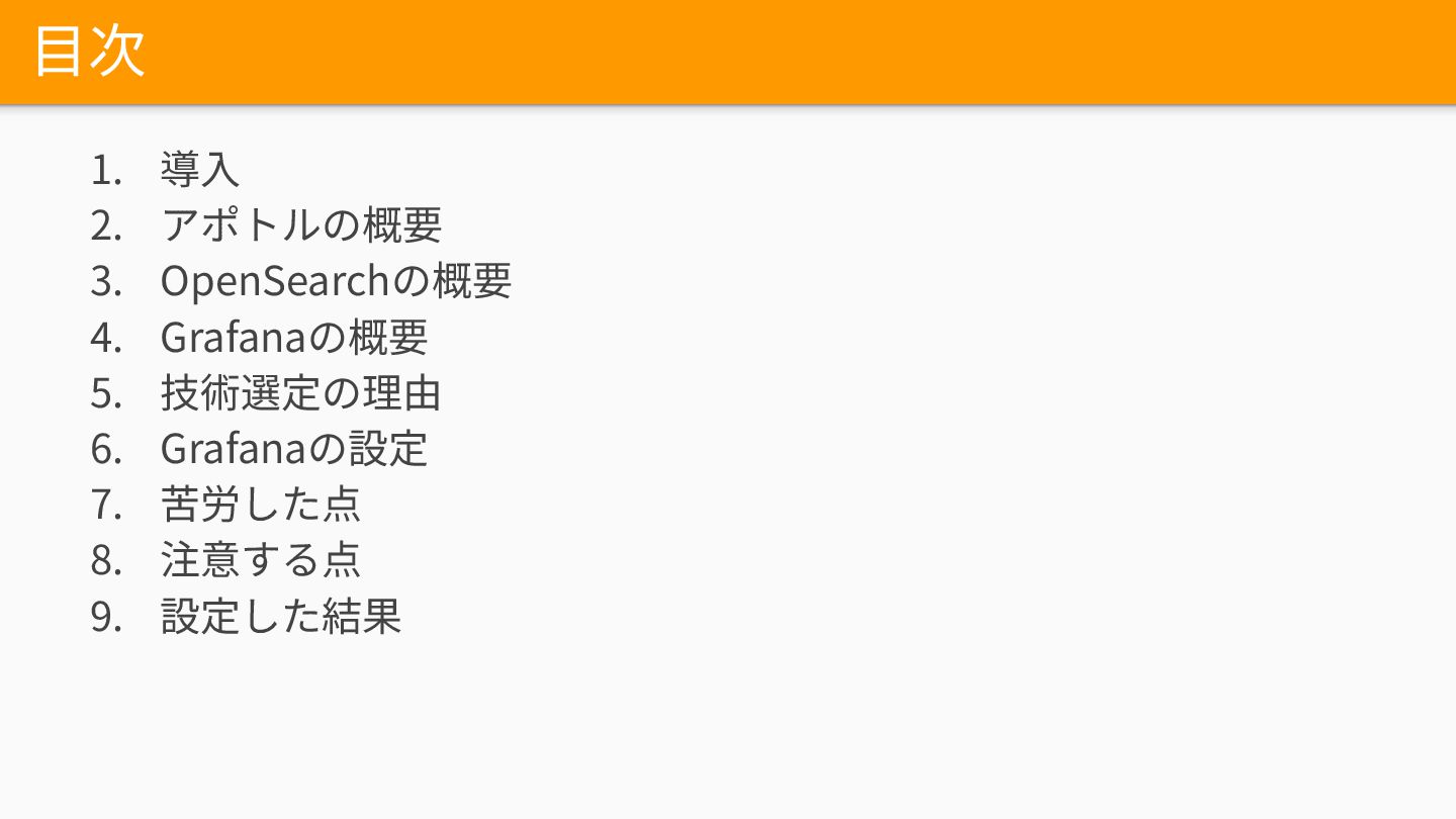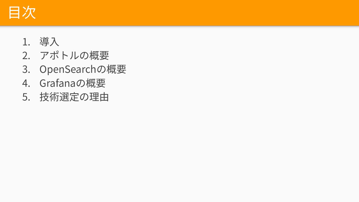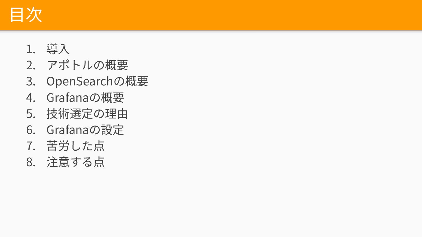 ⽬次 1. 導⼊ 2. アポトルの概要 3. OpenSearchの概要 4. Grafanaの概要 5.