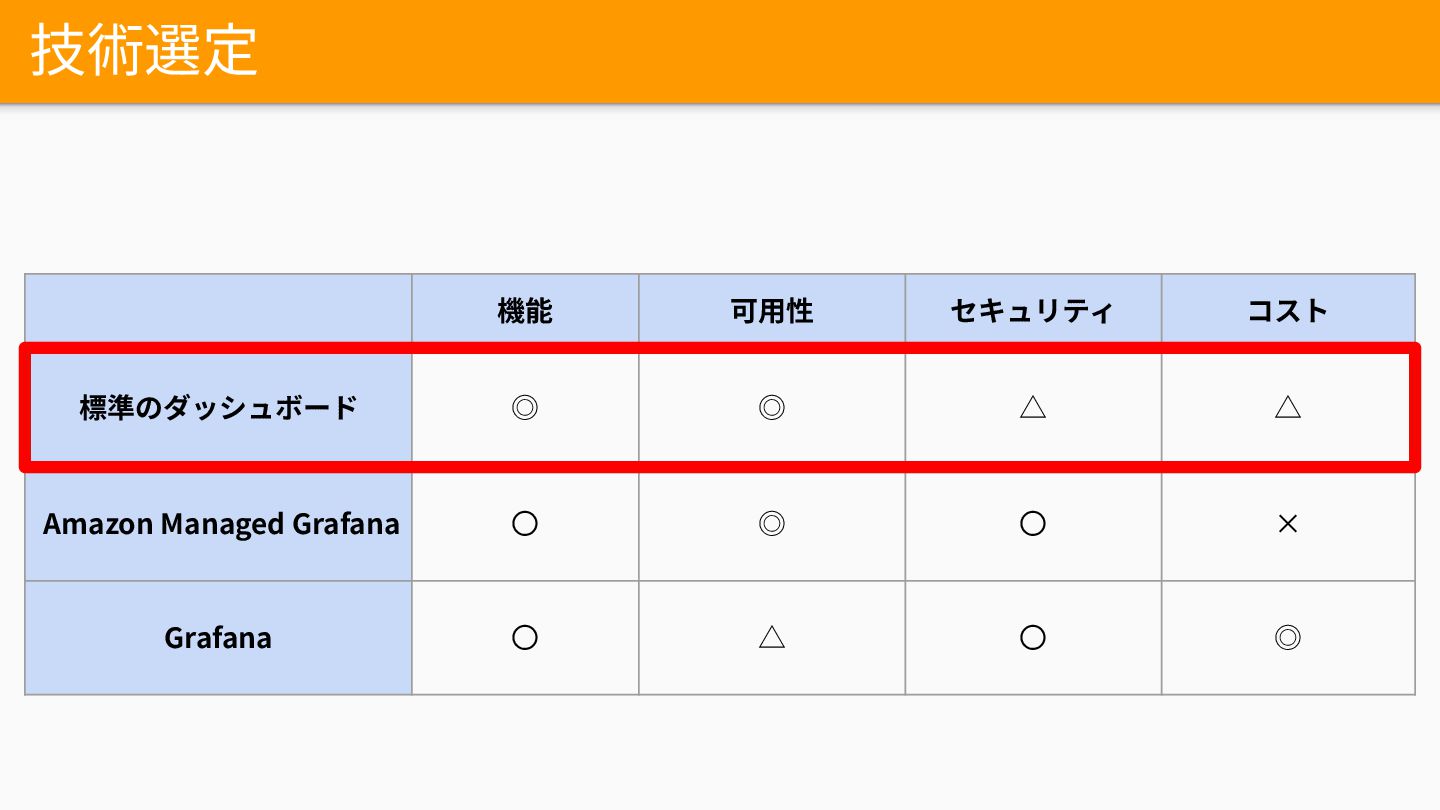 技術選定 機能 可⽤性 セキュリティ コスト 標準のダッシュボード ◎ ◎ △ △