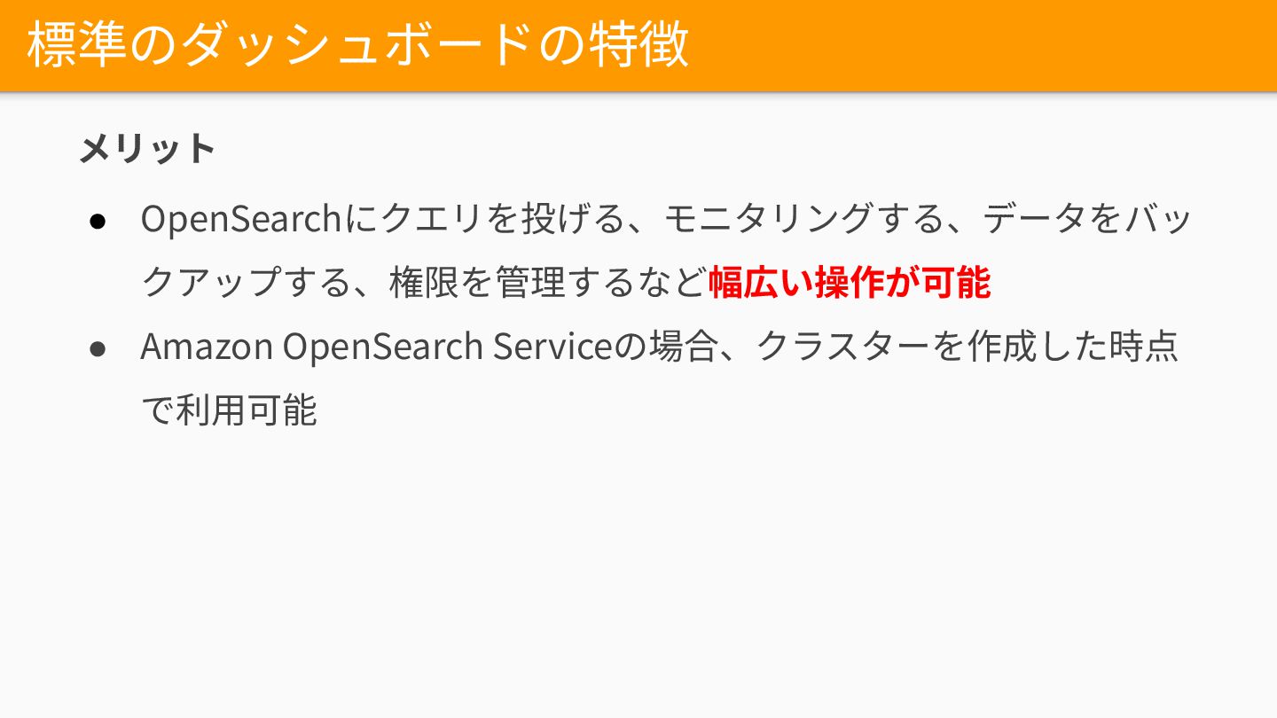 標準のダッシュボードの特徴 メリット • OpenSearchにクエリを投げる、モニタリングする、データをバッ クアップする、権限を管理するなど幅広い操作が可能 • Amazon OpenSearch Serviceの場合、クラスターを作成した時点 で利⽤可能