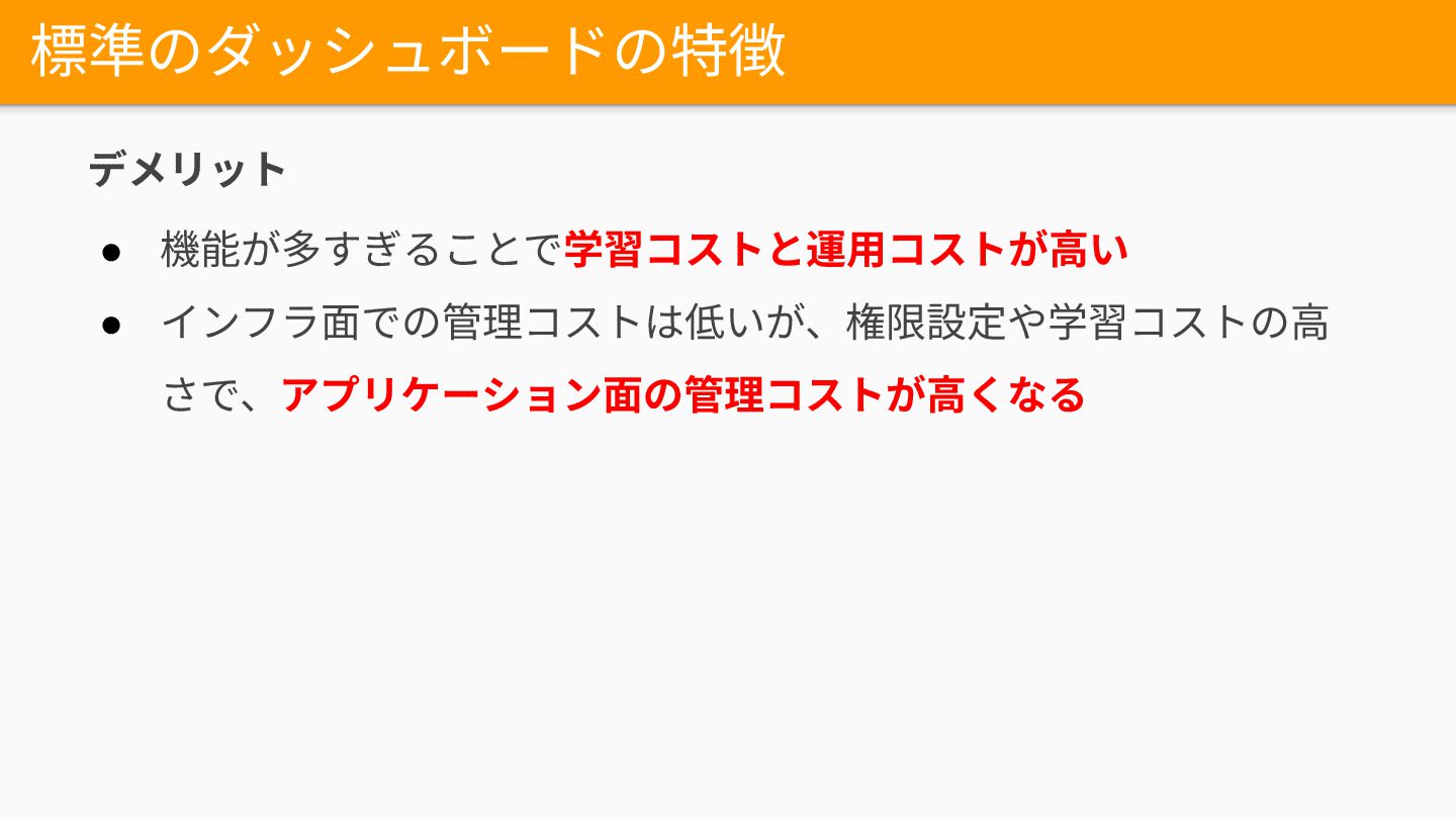 標準のダッシュボードの特徴 デメリット • 機能が多すぎることで学習コストと運⽤コストが⾼い • インフラ⾯での管理コストは低いが、権限設定や学習コストの⾼ さで、アプリケーション⾯の管理コストが⾼くなる