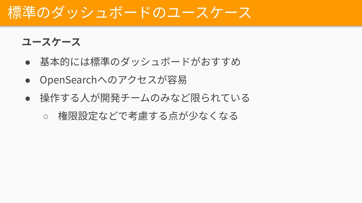 標準のダッシュボードのユースケース ユースケース • 基本的には標準のダッシュボードがおすすめ • OpenSearchへのアクセスが容易 • 操作する⼈が開発チームのみなど限られている ◦ 権限設定などで考慮する点が少なくなる