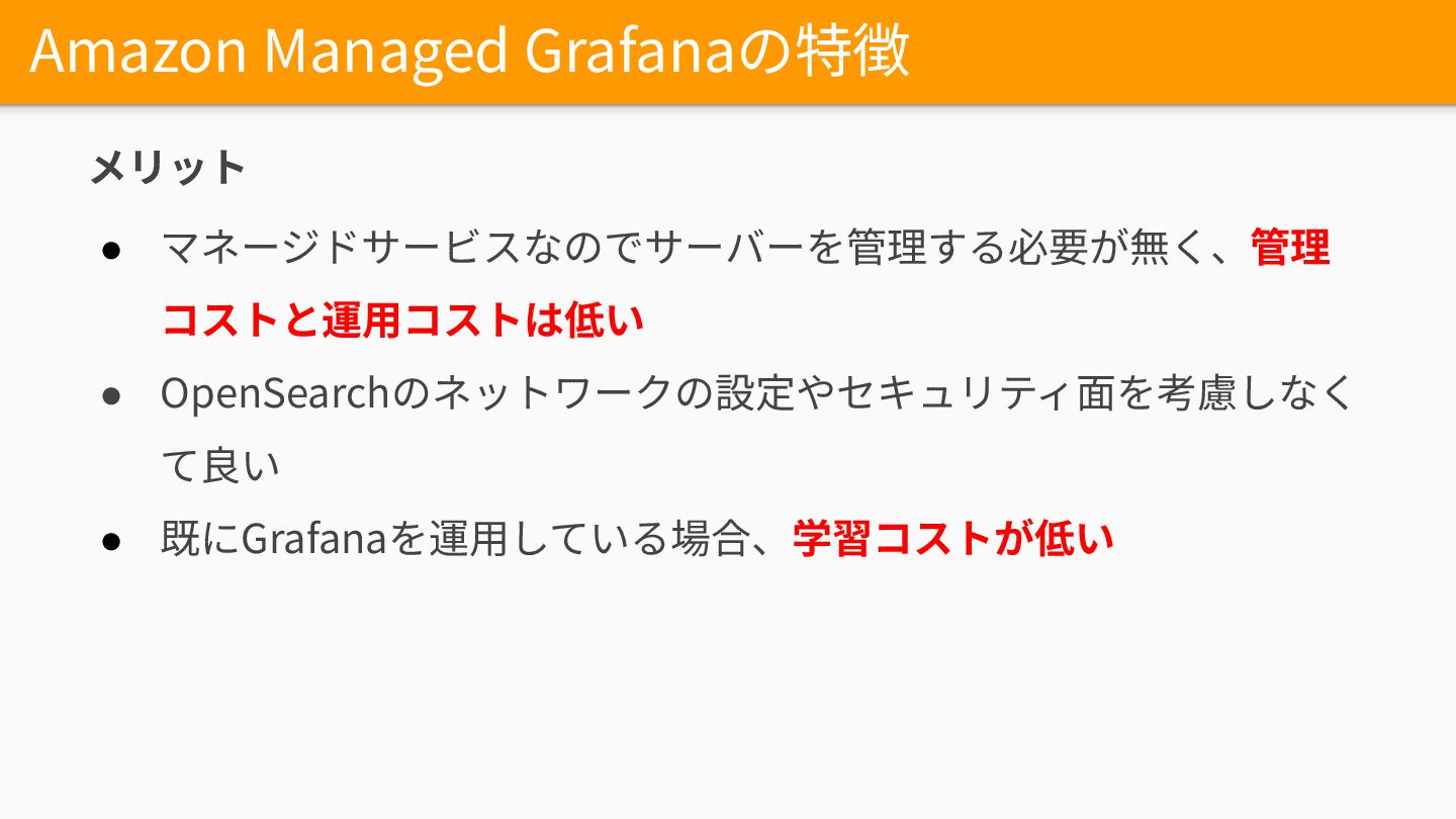 Amazon Managed Grafanaの特徴 メリット • マネージドサービスなのでサーバーを管理する必要が無く、管理 コストと運⽤コストは低い • OpenSearchのネットワークの設定やセキュリティ⾯を考慮しなく て良い