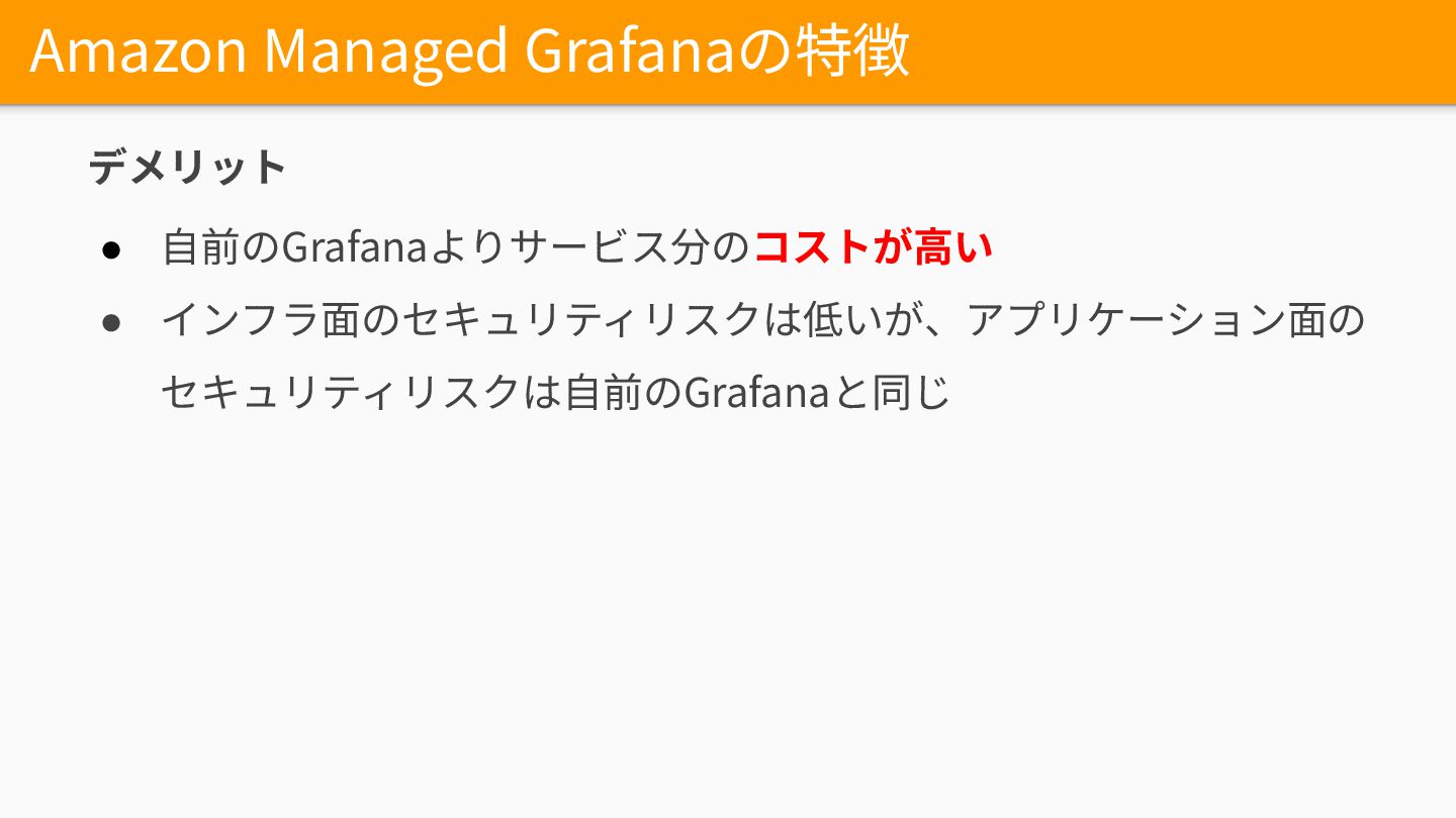 Amazon Managed Grafanaの特徴 デメリット • ⾃前のGrafanaよりサービス分のコストが⾼い • インフラ⾯のセキュリティリスクは低いが、アプリケーション⾯の セキュリティリスクは⾃前のGrafanaと同じ
