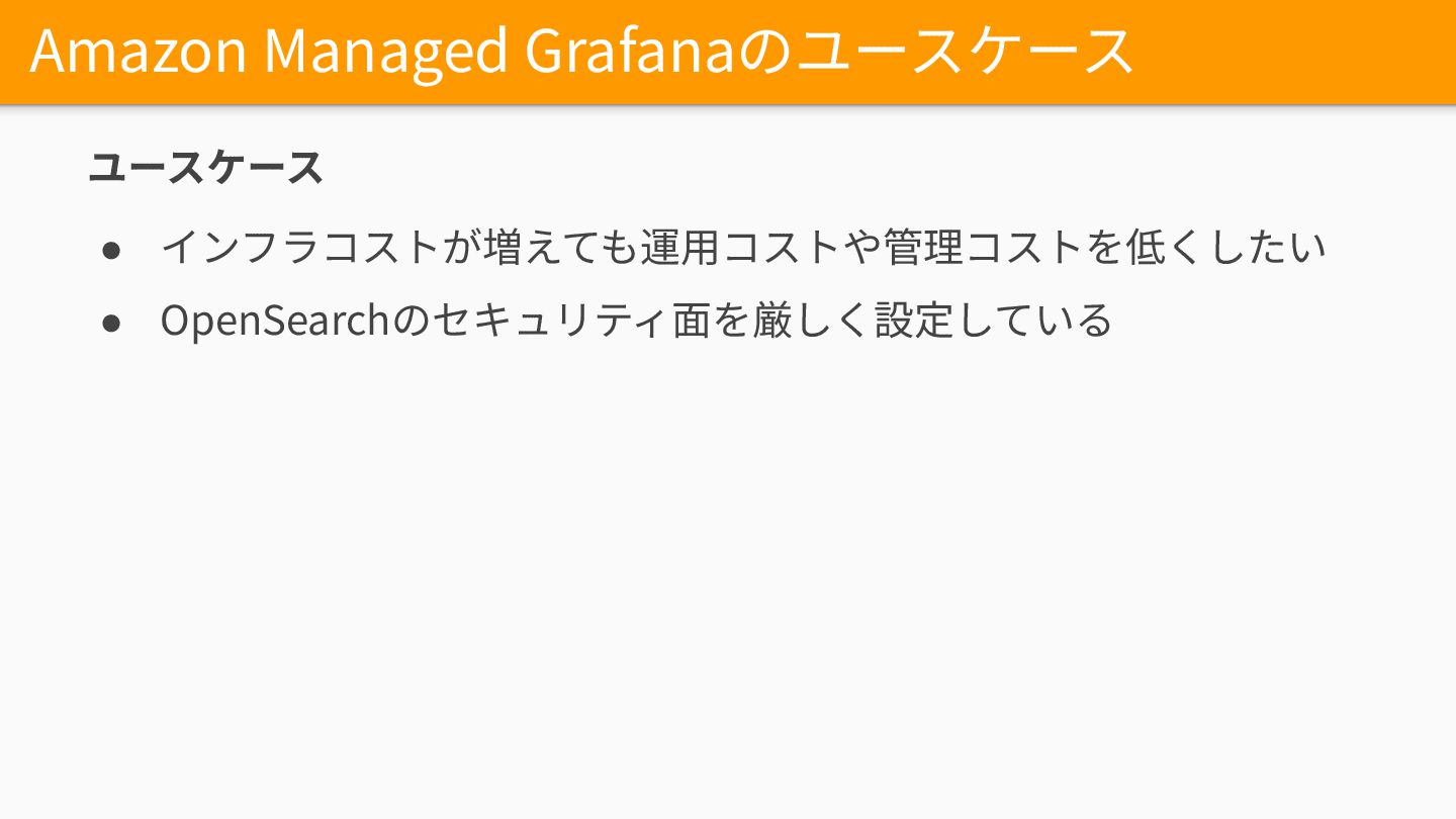 Amazon Managed Grafanaのユースケース ユースケース • インフラコストが増えても運⽤コストや管理コストを低くしたい • OpenSearchのセキュリティ⾯を厳しく設定している