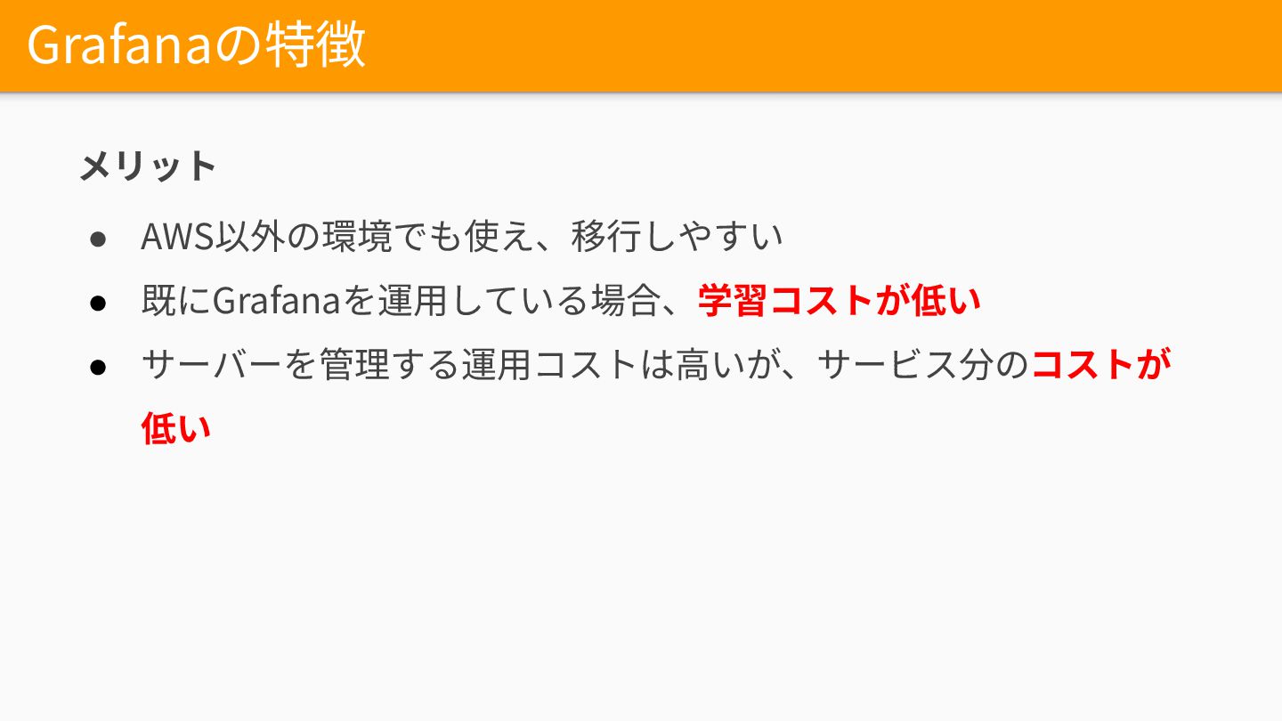 Grafanaの特徴 メリット • AWS以外の環境でも使え、移⾏しやすい • 既にGrafanaを運⽤している場合、学習コストが低い • サーバーを管理する運⽤コストは⾼いが、サービス分のコストが 低い