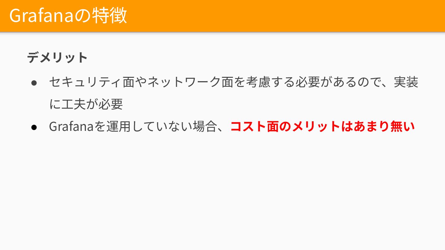 Grafanaの特徴 デメリット • セキュリティ⾯やネットワーク⾯を考慮する必要があるので、実装 に⼯夫が必要 • Grafanaを運⽤していない場合、コスト⾯のメリットはあまり無い