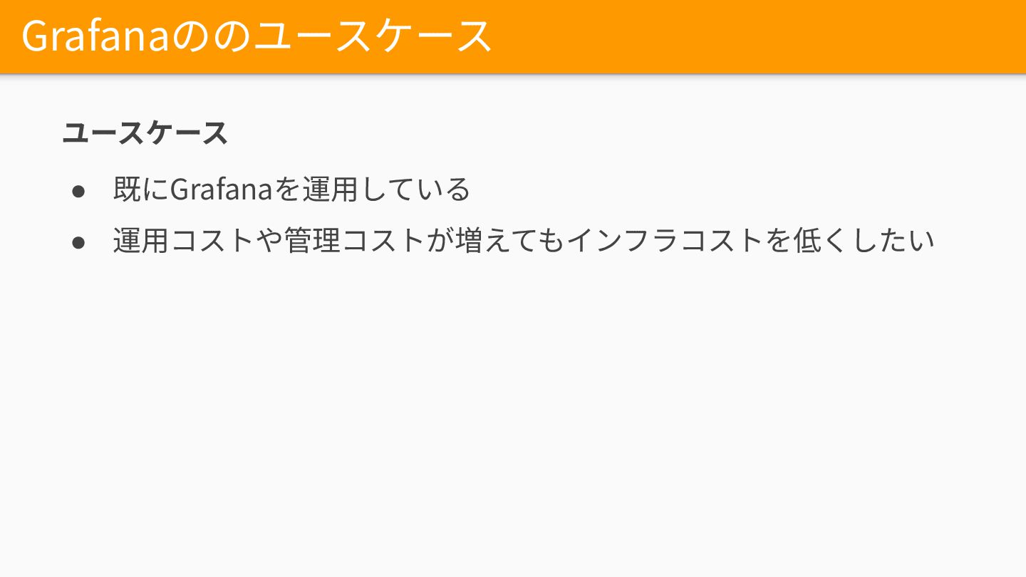 Grafanaののユースケース ユースケース • 既にGrafanaを運⽤している • 運⽤コストや管理コストが増えてもインフラコストを低くしたい