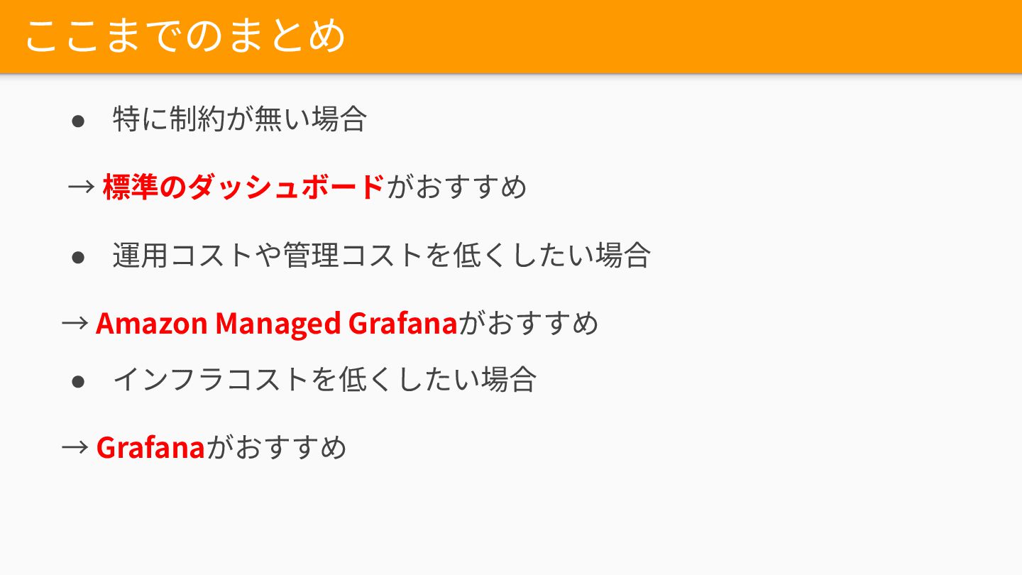 ここまでのまとめ • 特に制約が無い場合 → 標準のダッシュボードがおすすめ • 運⽤コストや管理コストを低くしたい場合 → Amazon Managed