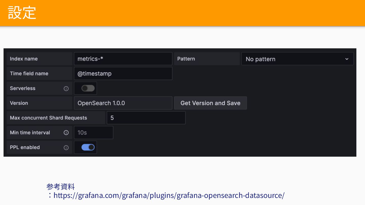 設定 参考資料 :https://grafana.com/grafana/plugins/grafana-opensearch-datasource/
