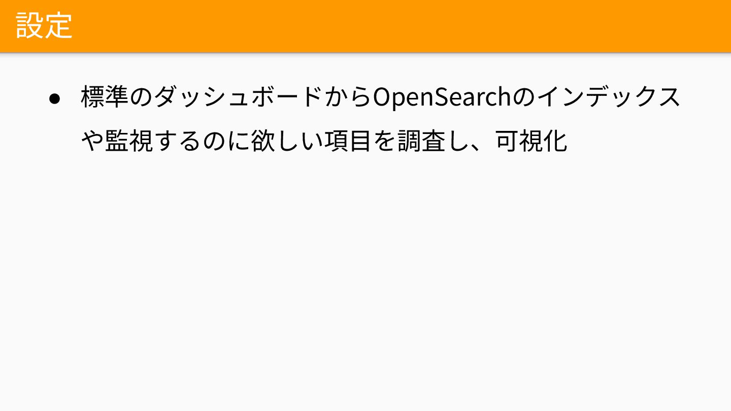 設定 • 標準のダッシュボードからOpenSearchのインデックス や監視するのに欲しい項⽬を調査し、可視化