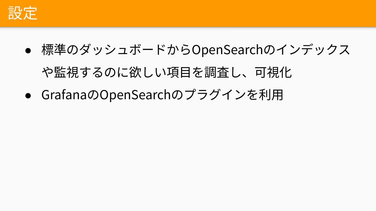 設定 • 標準のダッシュボードからOpenSearchのインデックス や監視するのに欲しい項⽬を調査し、可視化 • GrafanaのOpenSearchのプラグインを利⽤