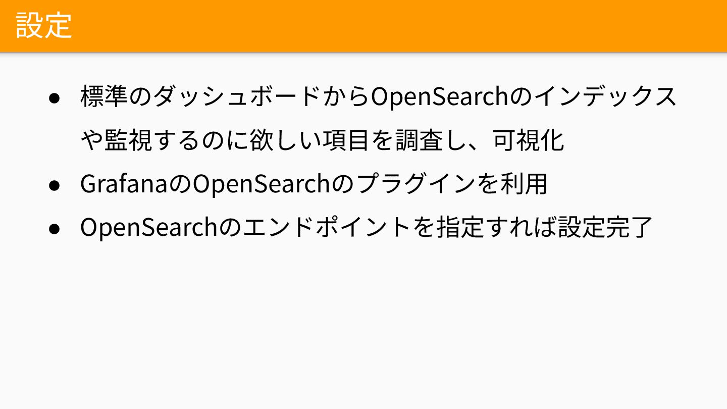 設定 • 標準のダッシュボードからOpenSearchのインデックス や監視するのに欲しい項⽬を調査し、可視化 • GrafanaのOpenSearchのプラグインを利⽤ • OpenSearchのエンドポイントを指定すれば設定完了