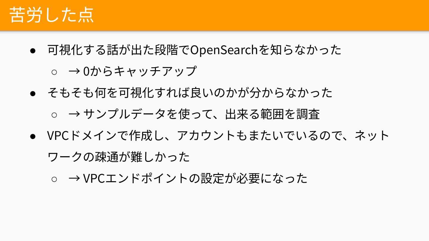 苦労した点 • 可視化する話が出た段階でOpenSearchを知らなかった ◦ → 0からキャッチアップ • そもそも何を可視化すれば良いのかが分からなかった ◦ →