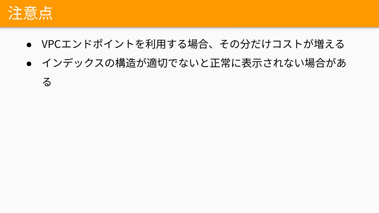 注意点 • VPCエンドポイントを利⽤する場合、その分だけコストが増える • インデックスの構造が適切でないと正常に表⽰されない場合があ る