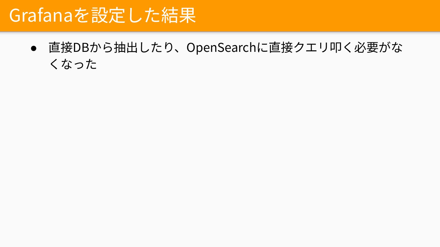 Grafanaを設定した結果 • 直接DBから抽出したり、OpenSearchに直接クエリ叩く必要がな くなった