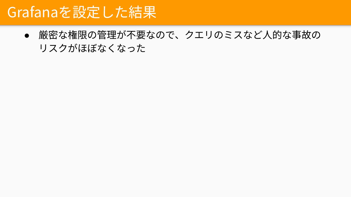 Grafanaを設定した結果 • 厳密な権限の管理が不要なので、クエリのミスなど⼈的な事故の リスクがほぼなくなった