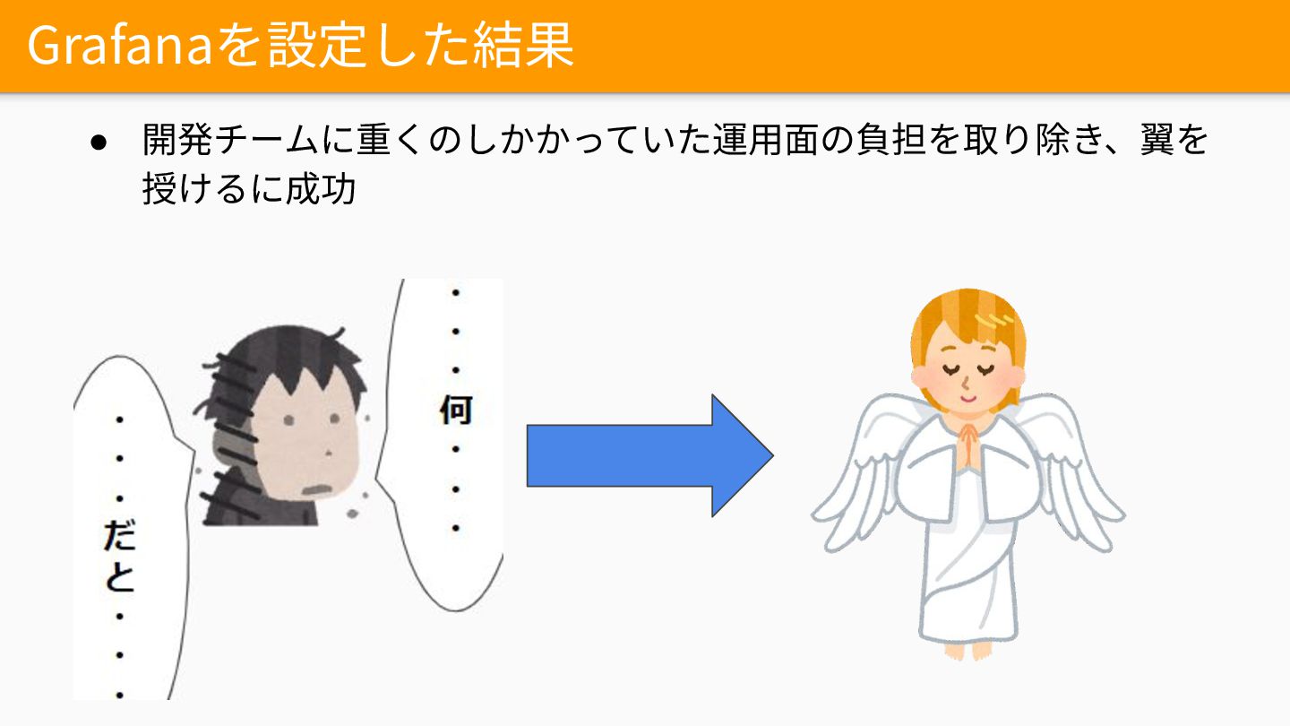 Grafanaを設定した結果 • 開発チームに重くのしかかっていた運⽤⾯の負担を取り除き、翼を 授けるに成功