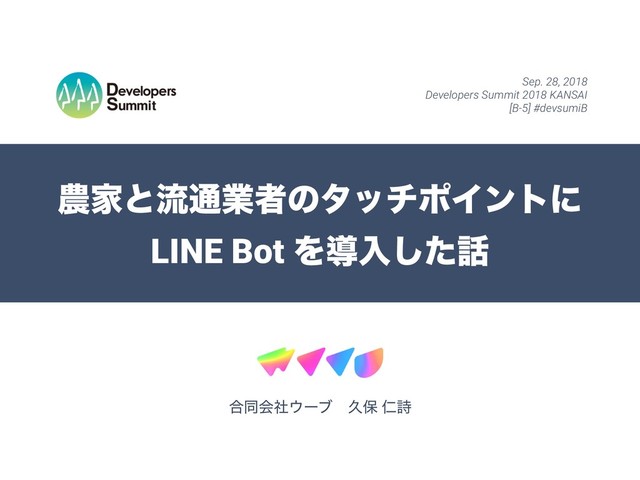 2018/09/28 Developers Summit 2018 KANSAI 【B-5】農家と流通業者のタッチポイントにLINE Botを導入した話 https://event.shoeisha.jp/devsumi/20180928/session/1811/