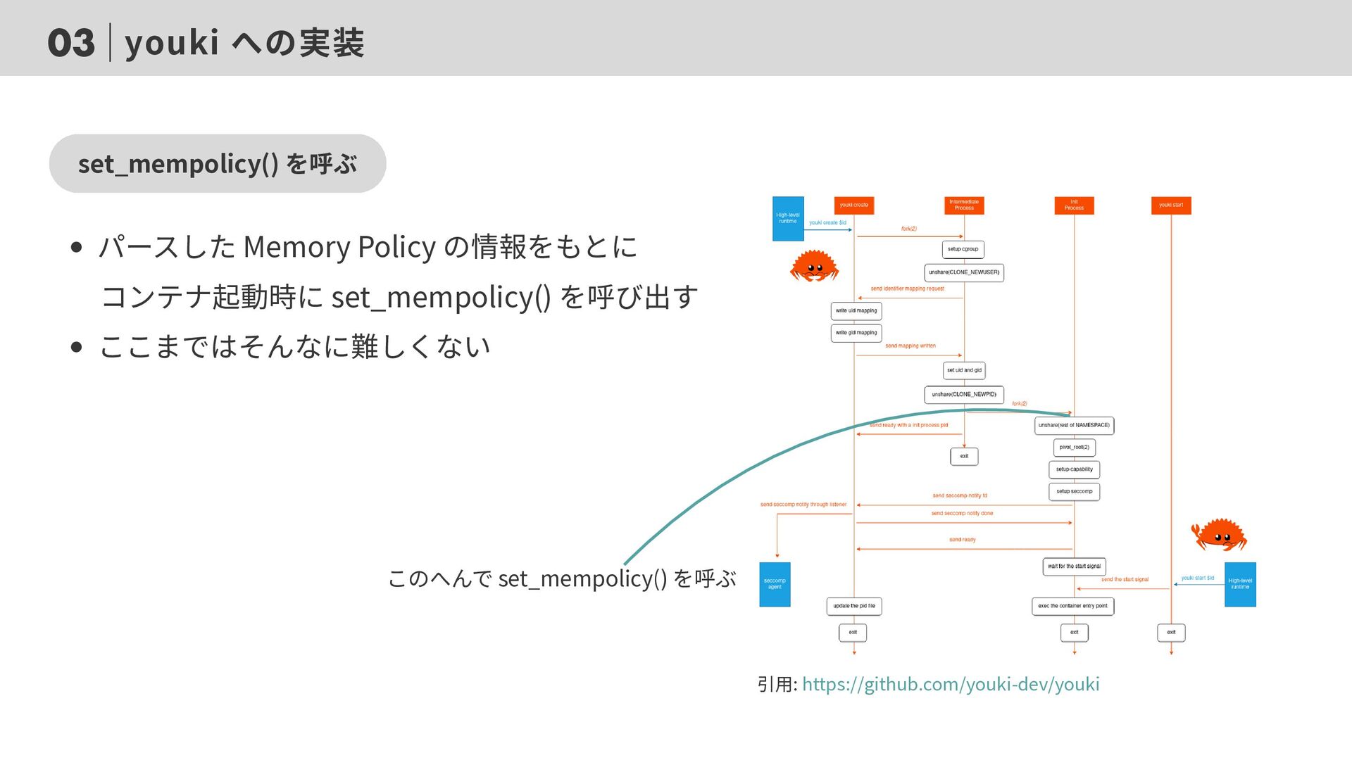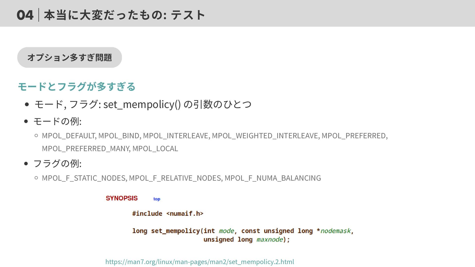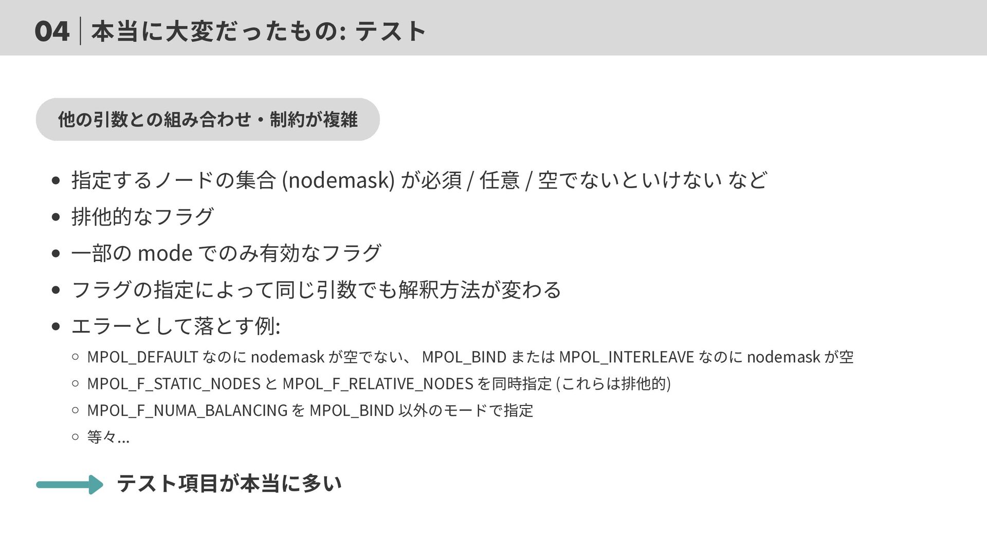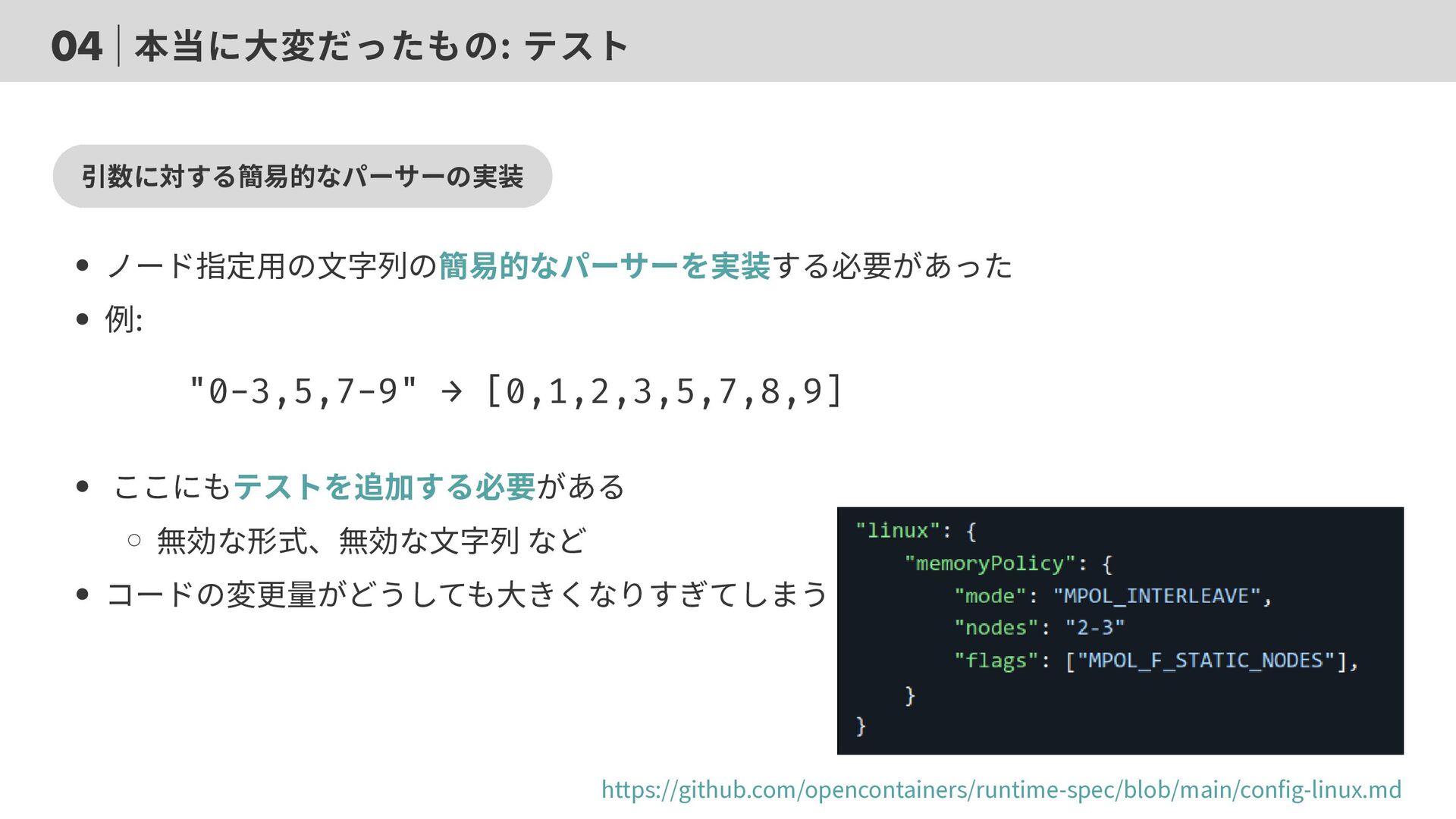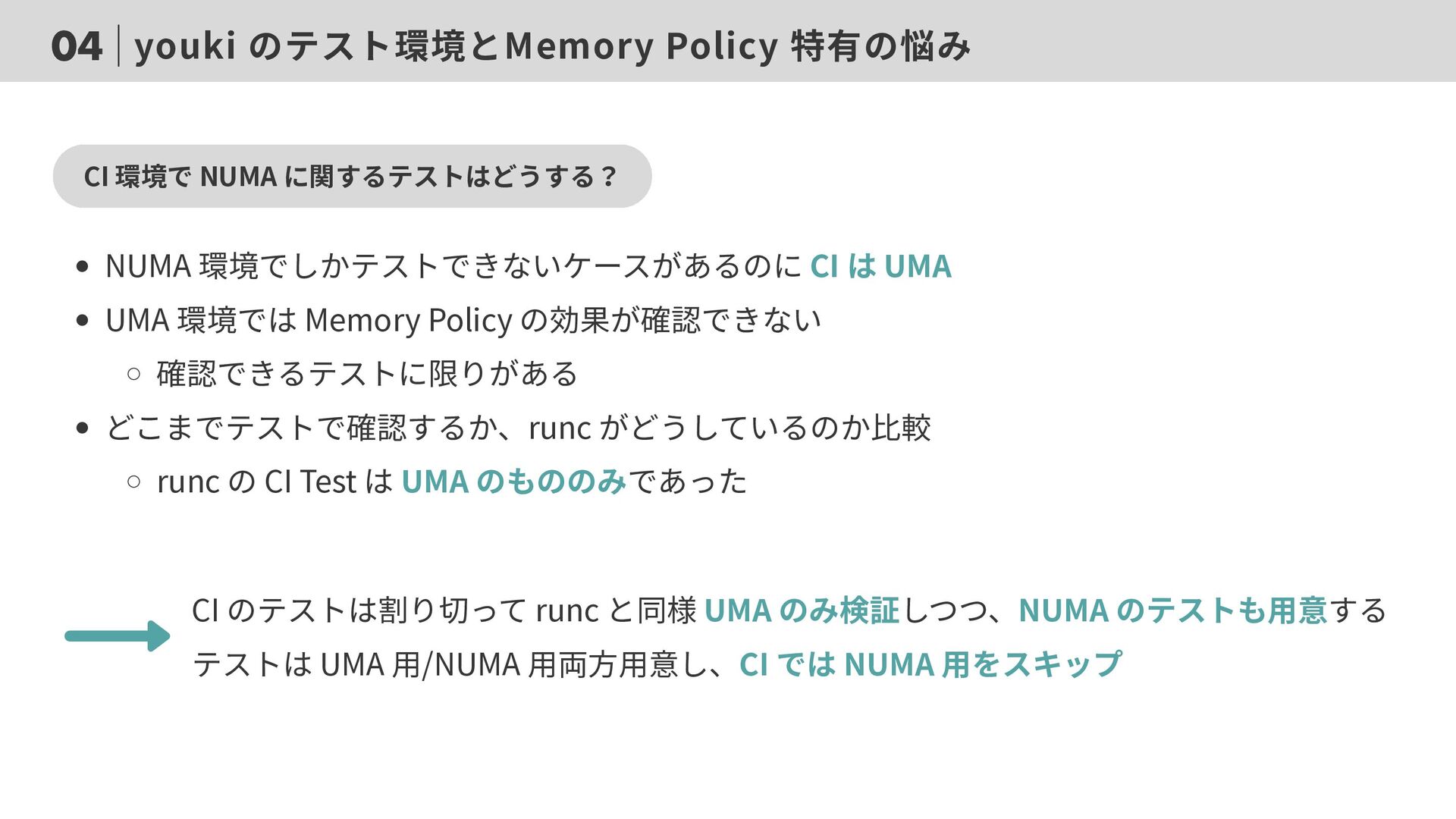 環境でしかテストできないケースがあるのに CI は UMA UMA 環境では Memory Policy の効果が確認できない 確認できるテストに限りがある どこまでテストで確認するか、runc がどうしているのか比較 runc の CI Test は UMA のもののみであった CI のテストは割り切って runc と同様 UMA のみ検証しつつ、NUMA のテストも用意する テストは UMA 用/NUMA 用両方用意し、CI では NUMA 用をスキップ