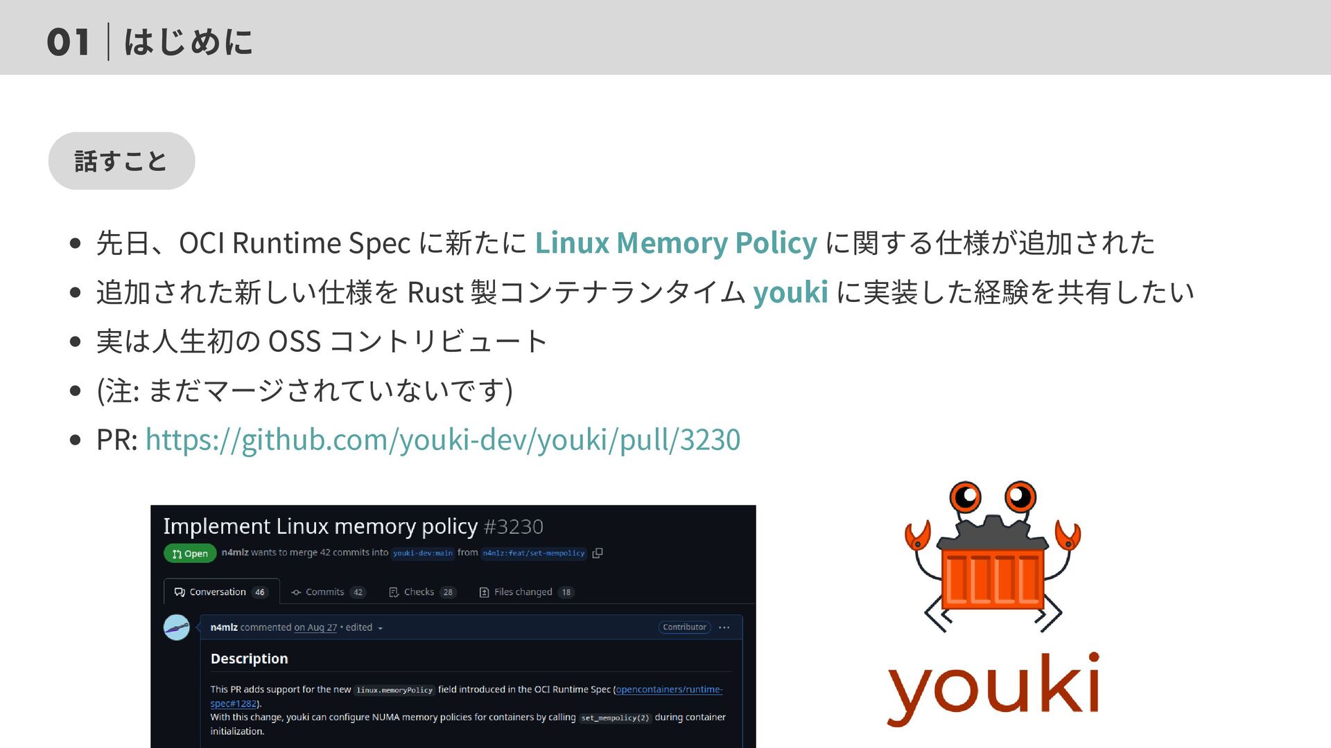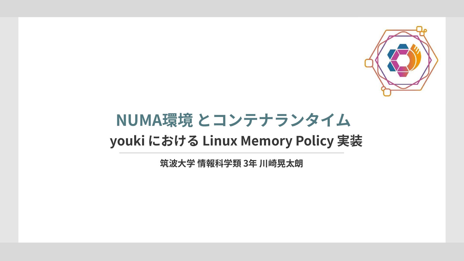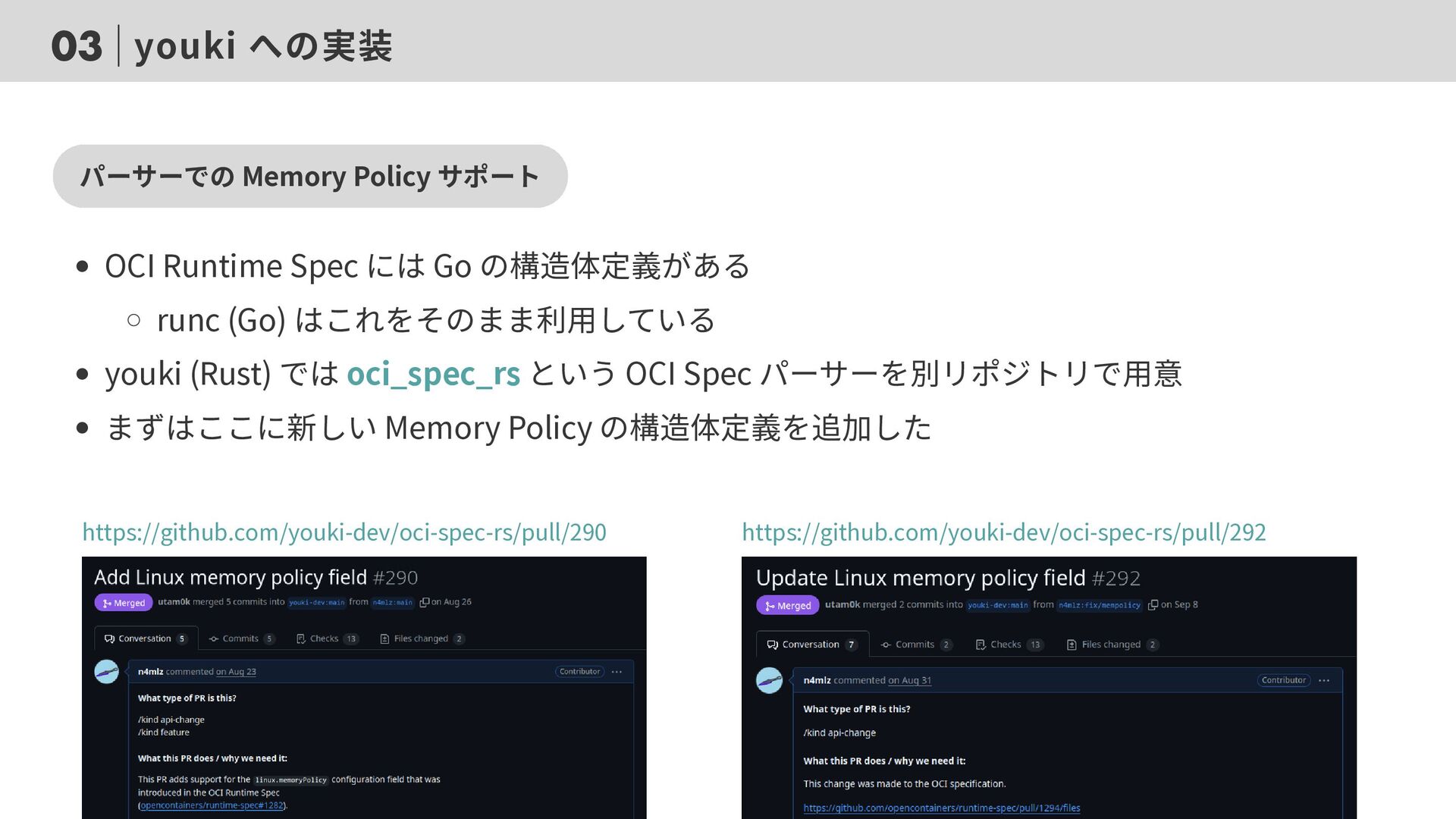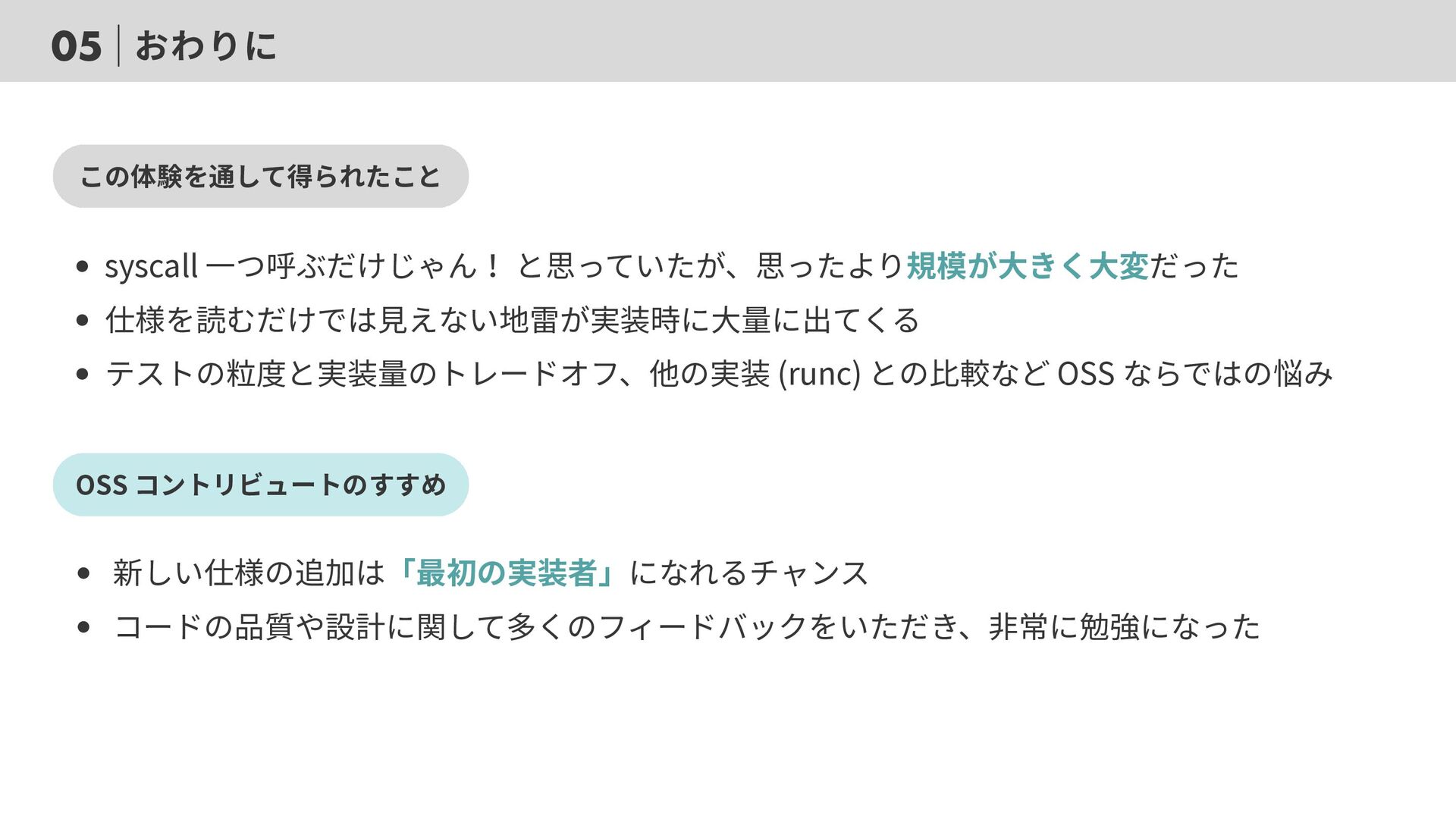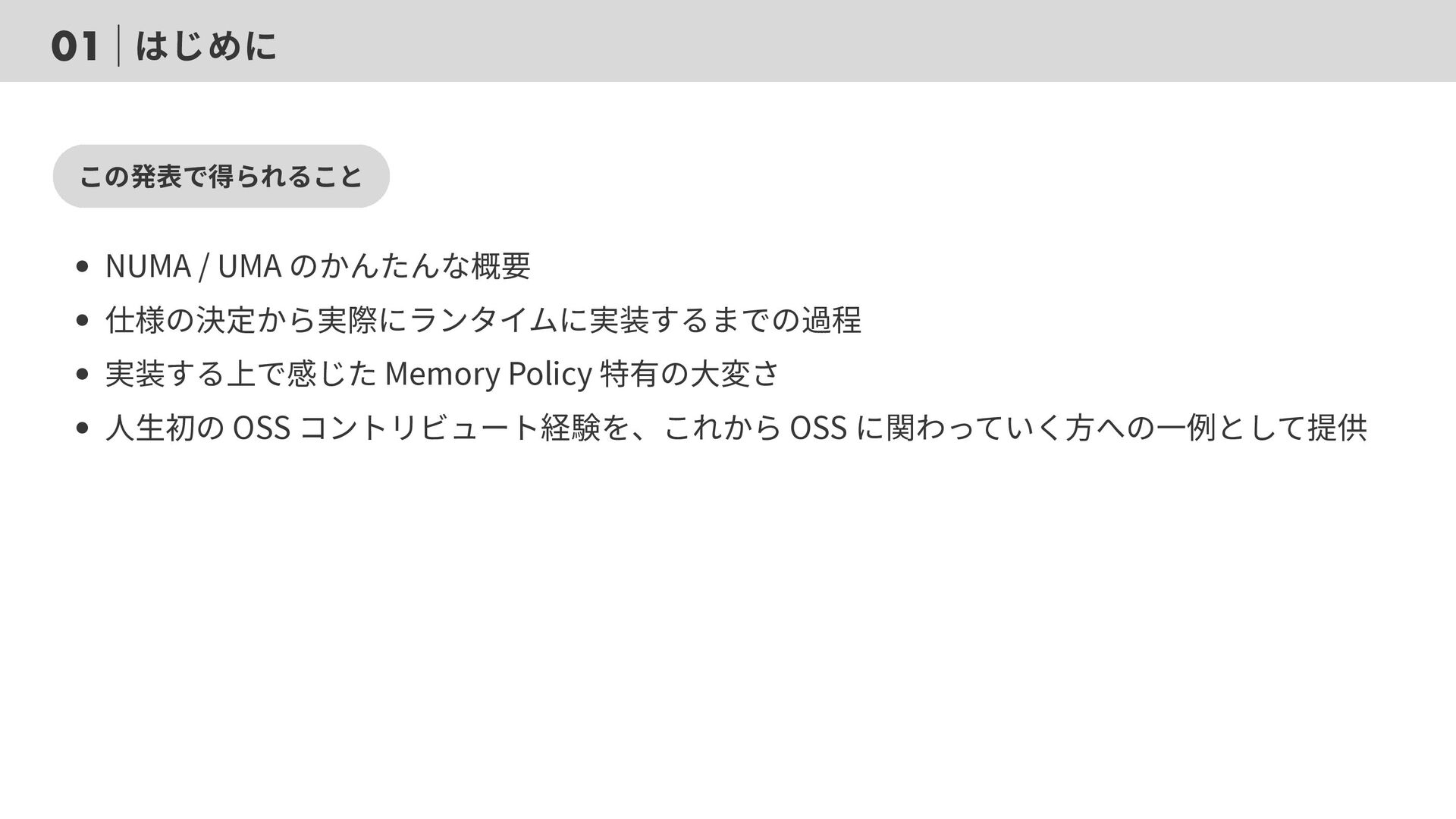 環境でしかテストできないケースがあるのに CI は UMA UMA 環境では Memory Policy の効果が確認できない 確認できるテストに限りがある どこまでテストで確認するか、runc がどうしているのか比較 runc の CI Test は UMA のもののみであった CI のテストは割り切って runc と同様 UMA のみ検証しつつ、NUMA のテストも用意する テストは UMA 用/NUMA 用両方用意し、CI では NUMA 用をスキップ