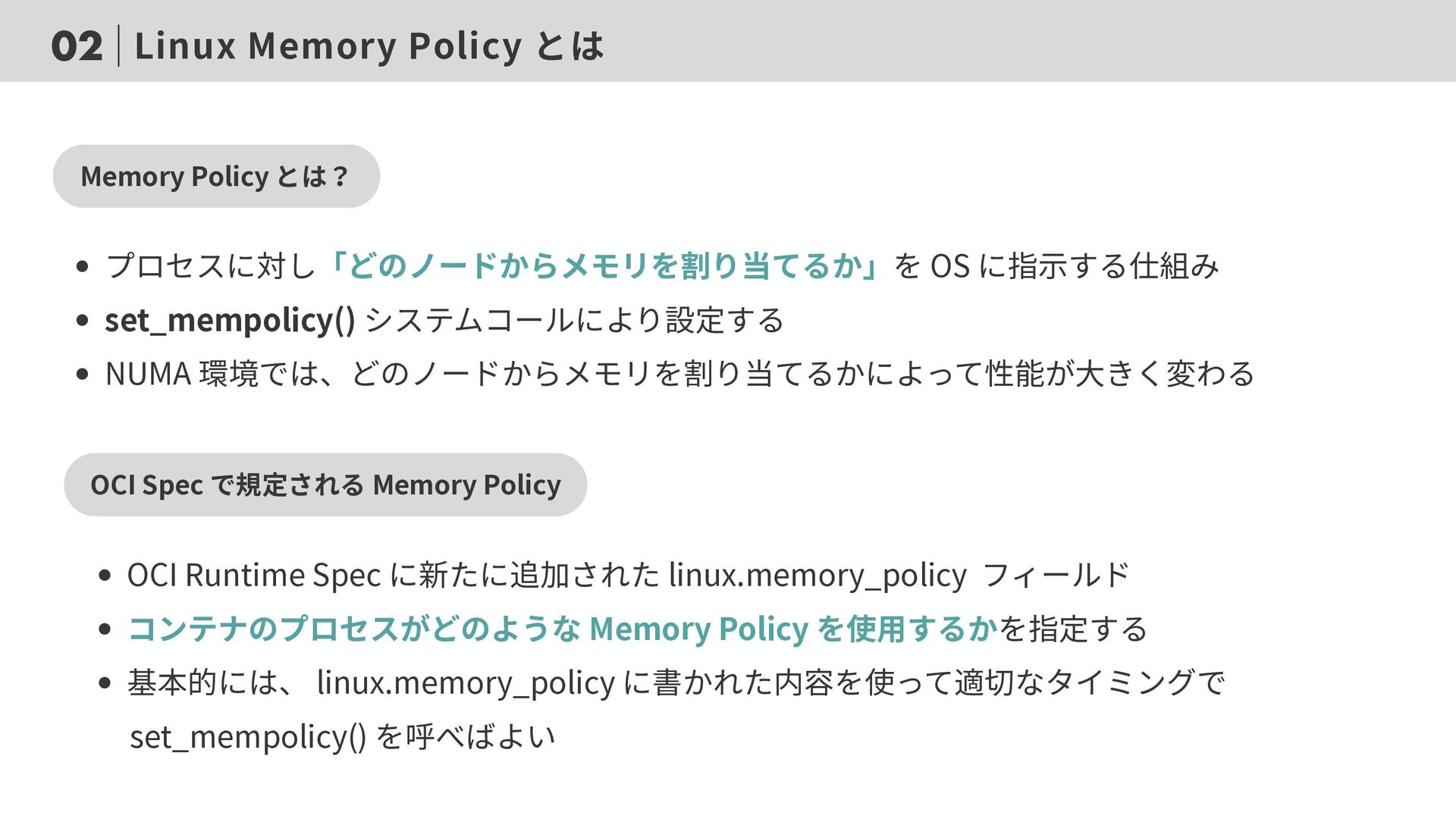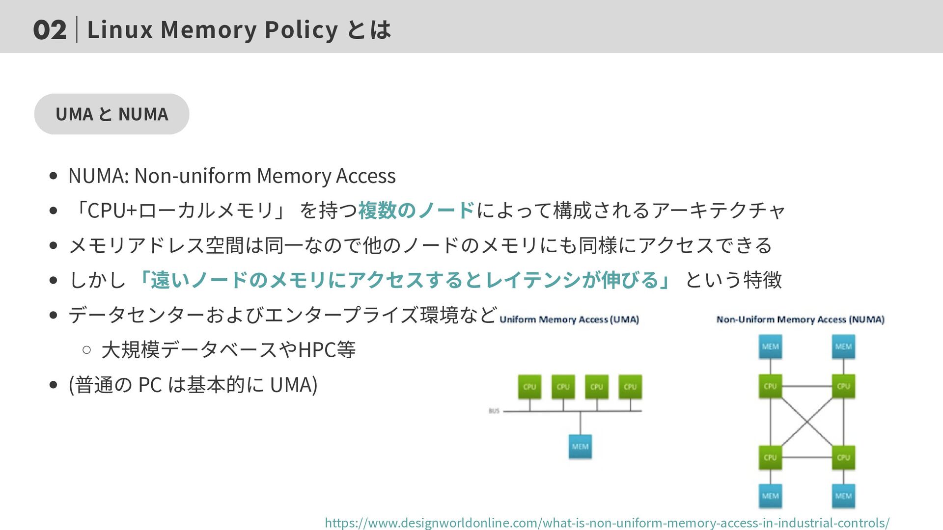 データセンターおよびエンタープライズ環境など 大規模データベースやHPC等 (普通の PC は基本的に UMA) Linux Memory Policy とは 02 UMA と NUMA https://www.designworldonline.com/what-is-non-uniform-memory-access-in-industrial-controls/