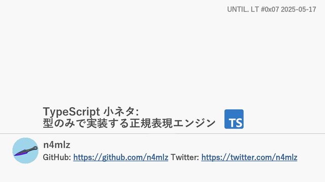 TypeScript 小ネタ: 型のみで実装する正規表現エンジン n4mlz GitHub: https://github.com/n4mlz Twitter: https://twitter.com/n4mlz UNTIL. LT