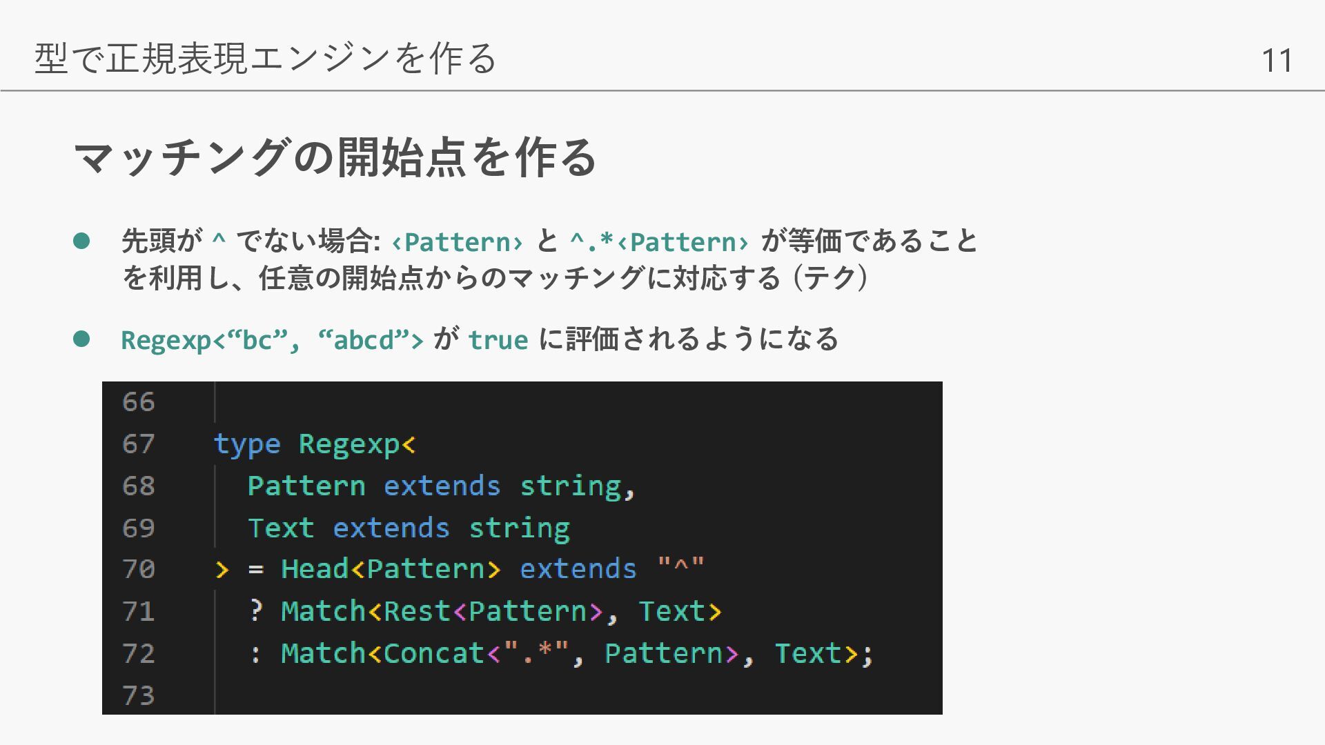 を利用し、任意の開始点からのマッチングに対応する (テク) ⚫ Regexp<“bc”, “abcd”> が true に評価されるようになる 型で正規表現エンジンを作る