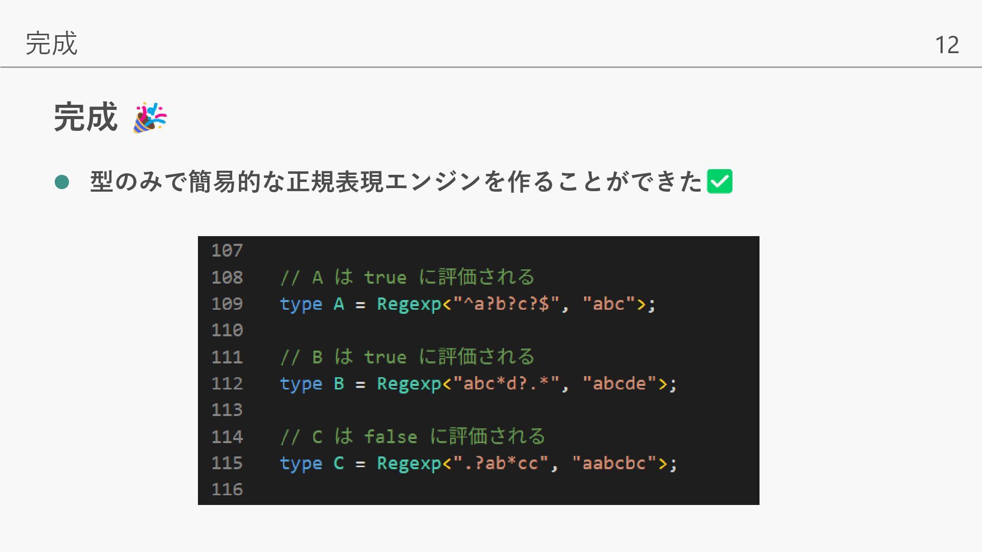 12 完成 ⚫ 型のみで簡易的な正規表現エンジンを作ることができた 完成