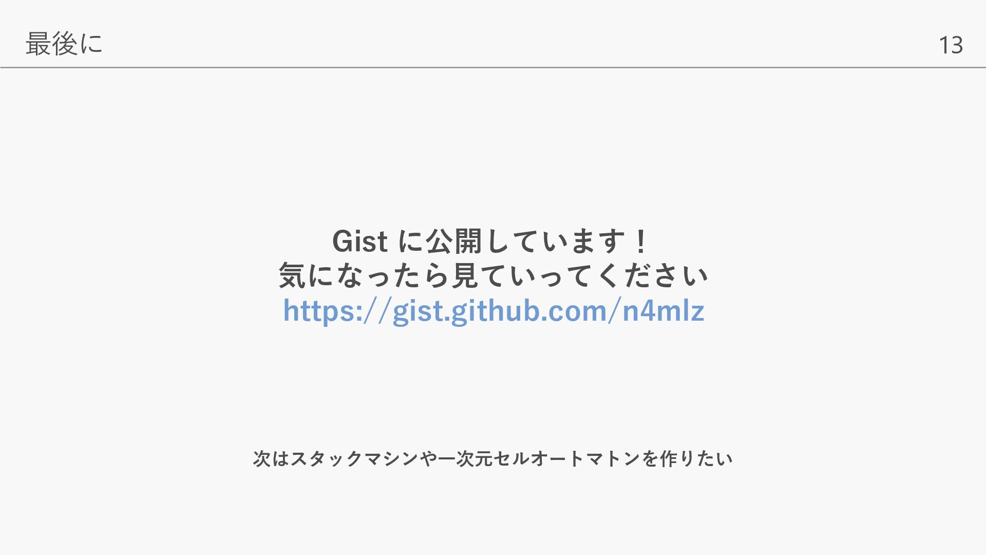 13 最後に Gist に公開しています! 気になったら見ていってください https://gist.github.com/n4mlz 次はスタックマシンや一次元セルオートマトンを作りたい