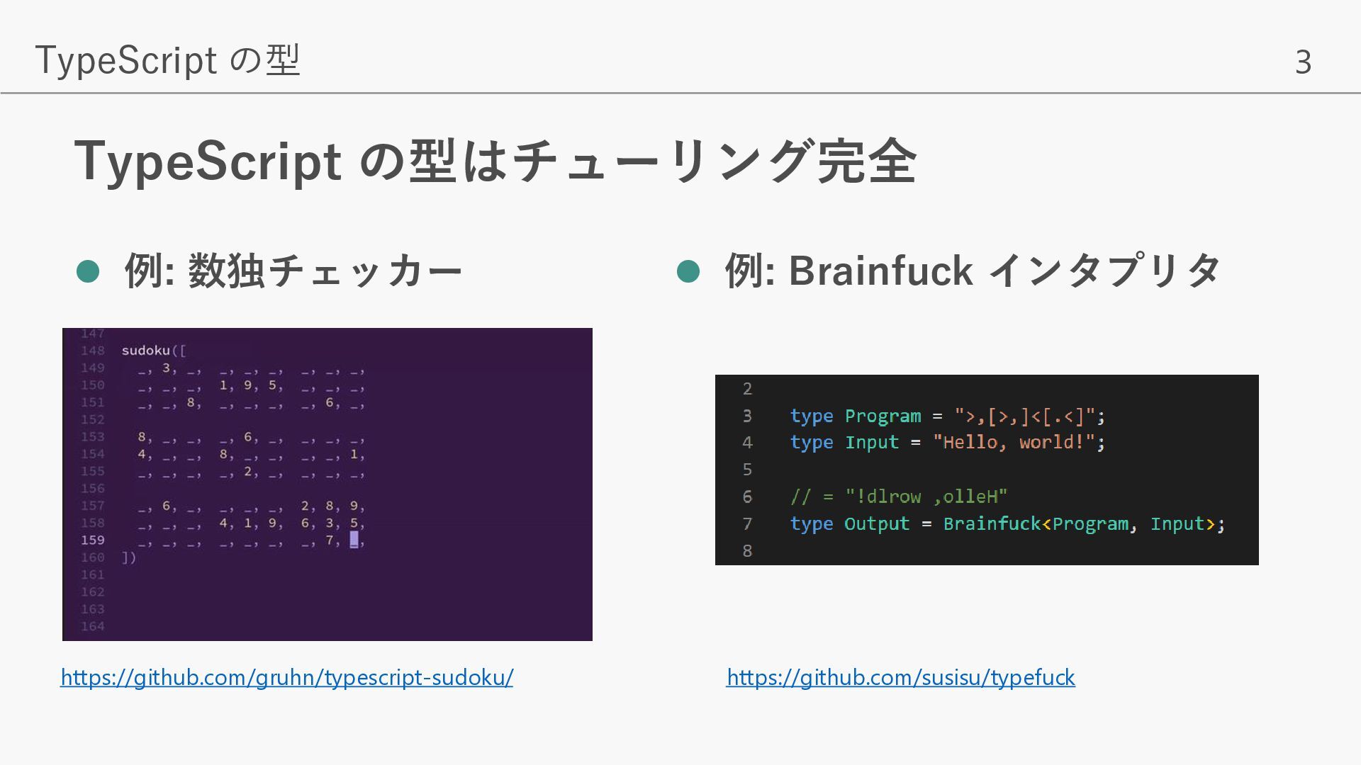 Brainfuck インタプリタ https://github.com/gruhn/typescript-sudoku/ https://github.com/susisu/typefuck