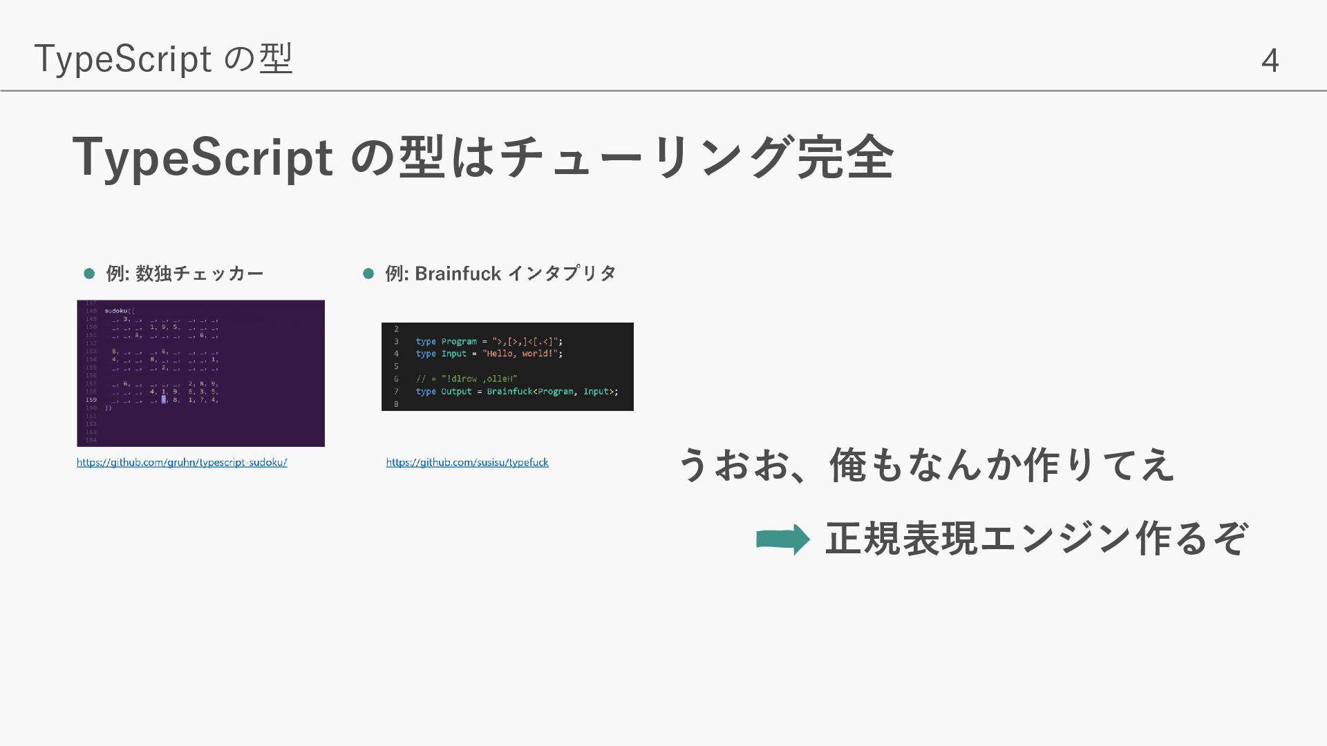 4 TypeScript の型はチューリング完全 TypeScript の型 うおお、俺もなんか作りてえ 正規表現エンジン作るぞ