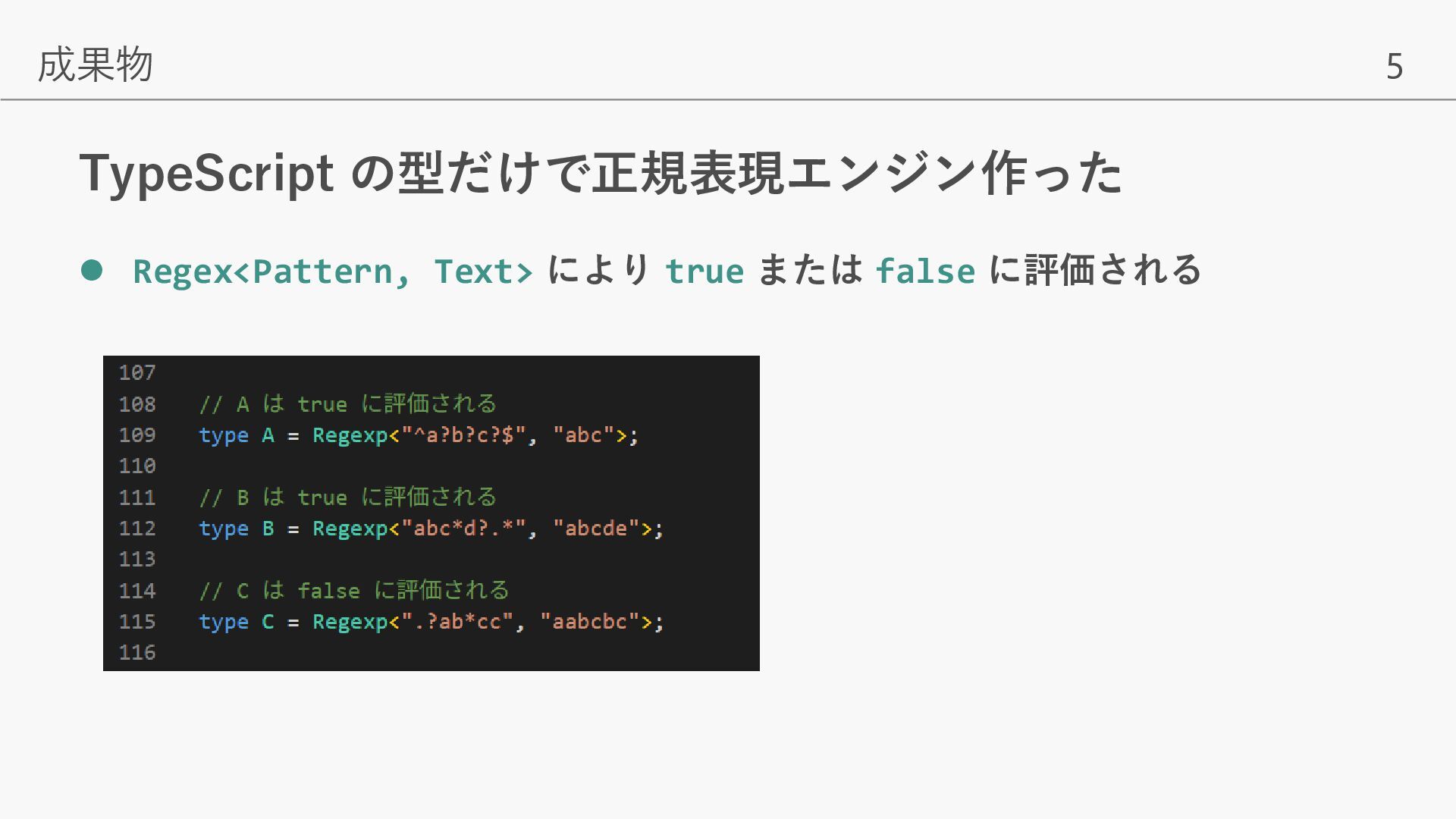5 TypeScript の型だけで正規表現エンジン作った ⚫ Regex<Pattern, Text> により true または false