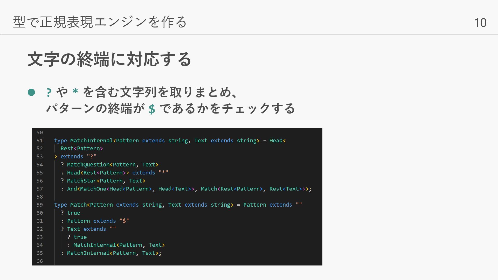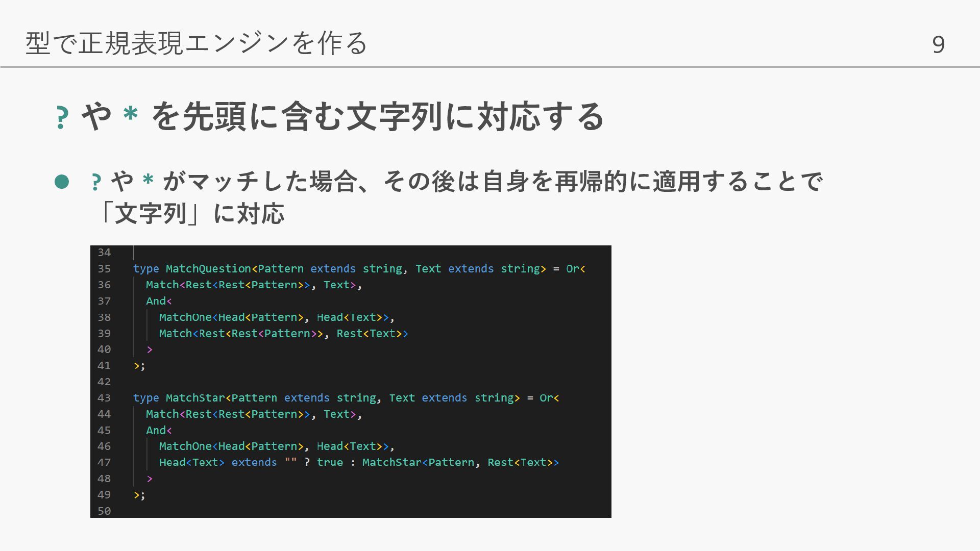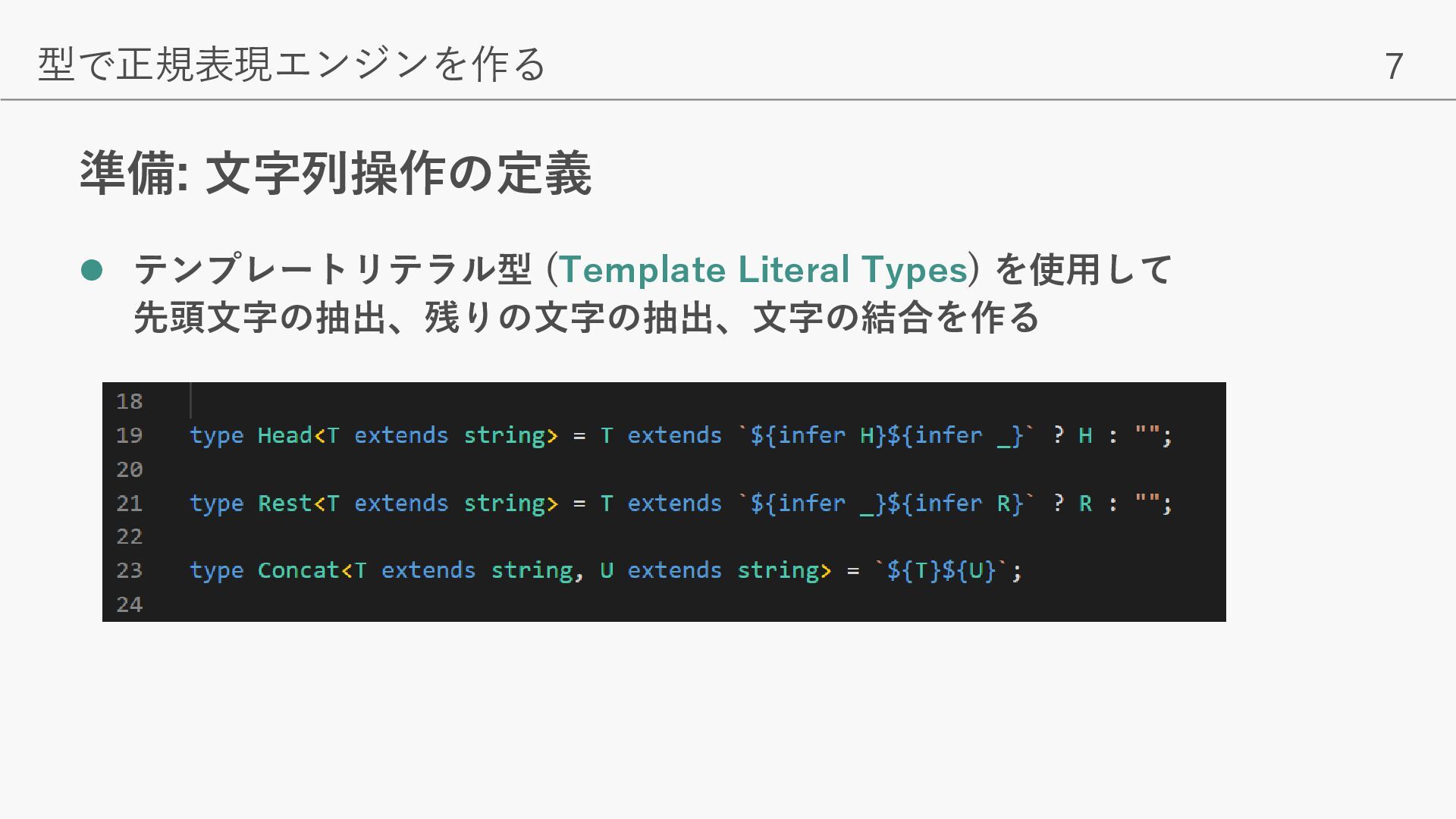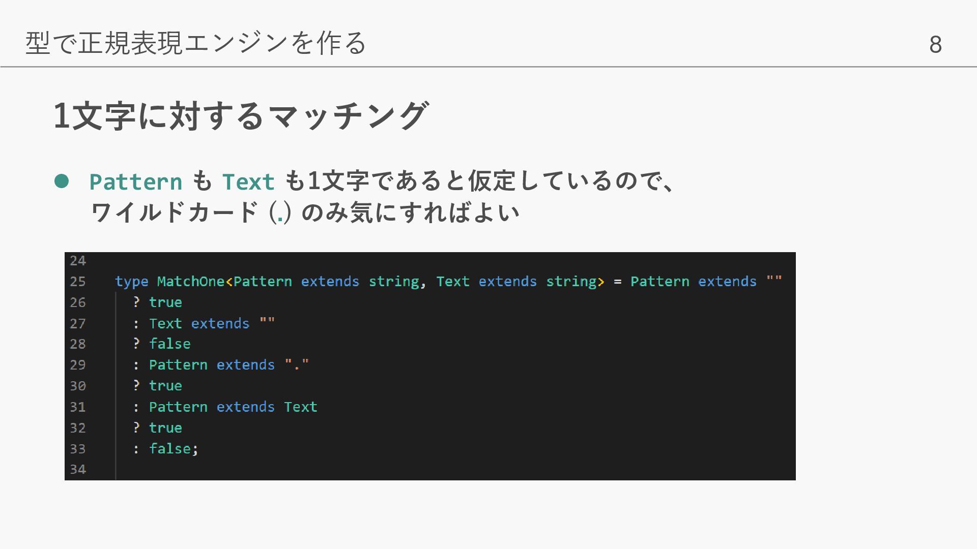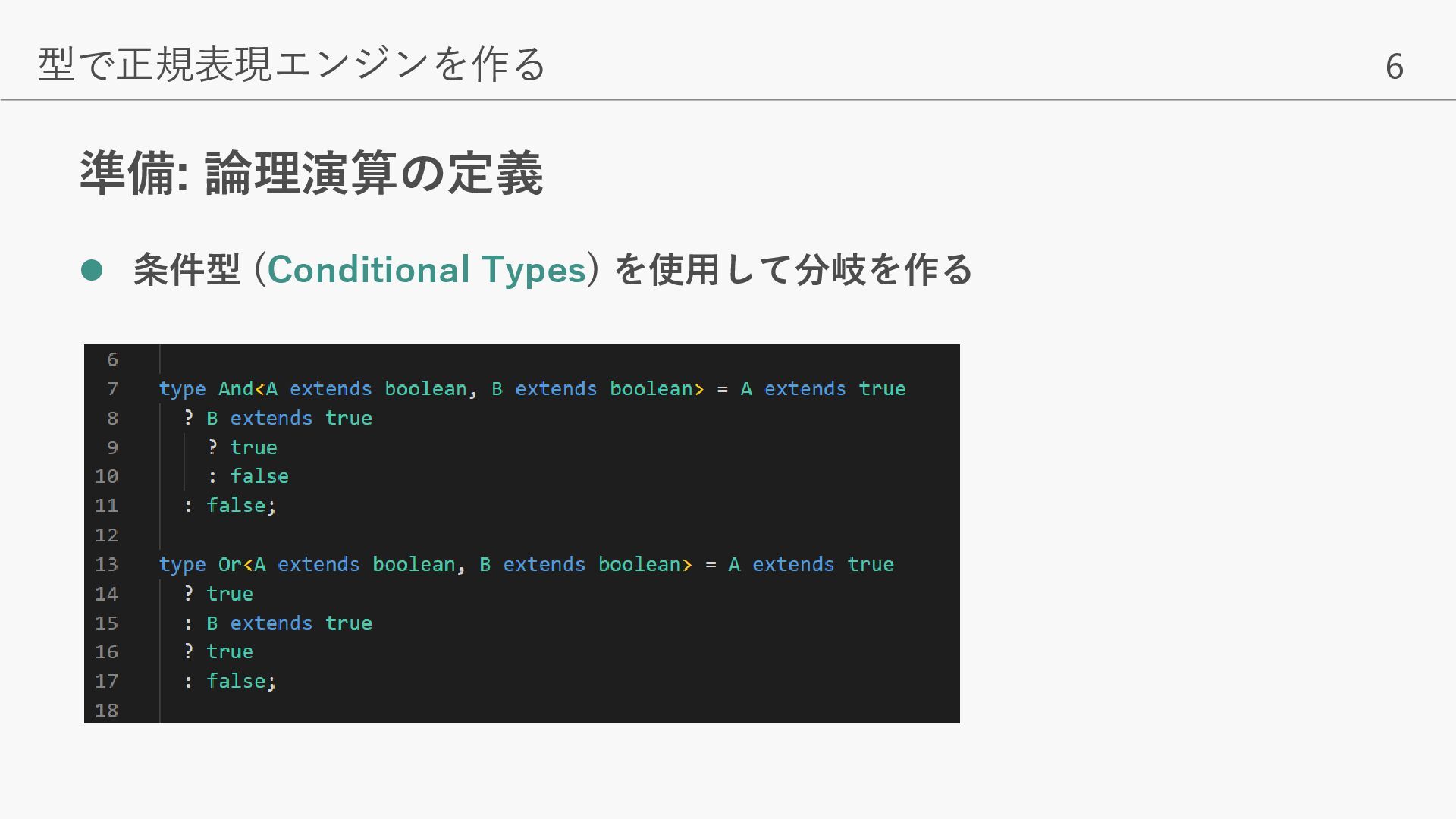 6 準備: 論理演算の定義 ⚫ 条件型 (Conditional Types) を使用して分岐を作る 型で正規表現エンジンを作る