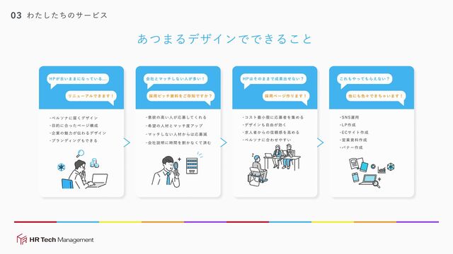 ン ・ 目 的 に 合 っ た ペ ー ジ 構 成 ・ 企 業 の 魅 力 が 伝 わ る デザイ ン ・ ブ ラ ン ディ ン グ もで き る リ ニ ュ ー アル で き ま す ! H P が 古 い ま ま に な って い る . . . ・ 意 欲 の 高 い 人 が 応 募 して く れ る ・ 希 望 の 人 材 と マ ッ チ 度 アッ プ ・ マ ッ チ し な い 人 材 か ら は 応 募 減 ・ 会 社 説 明 に 時 間 を 割 か な くて 済 む 採 用 ピッ チ 資 料 を ご 存 知 で す か ? 会 社 と マ ッ チ し な い 人 が 多 い ! ・ コ ス ト 最 小 限 に 応 募 者 を 集 め る ・ デザイ ン も 自 由 が 効 く ・ 求 人 者 か ら の 信 頼 感 を 高 め る ・ ペ ル ソ ナ に 合 わ せ や す い 採 用 ペ ー ジ 作 り ま す ! H P は そ の ま ま で 成 果 出 せ な い ? 他 に も 色 々 で き ち ゃ い ま す ! こ れ も や って も ら え な い ? ・ SNS運用 ・ LP作 成 ・ ECサ イ ト 作 成 ・ 営 業 資料作 成 ・ バ ナ ー 作成 あつま るデザインでできる こ と 03 わたした ち の サ ー ビ ス