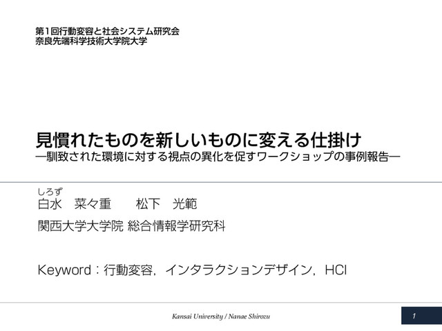 ಛఆͷߦಈΛҾ͖ى͜͢͜ͱ • Ҿ͖ى͜͞Εͨߦಈ͕՝Λղܾ͢Δ͜ͱ • ཧతͳτϦΨ • ޒײͷ͍ͣΕ͔Ͱਓ͕֮Ͱ͖Δܹ • ৺ཧతͳτϦΨ • ֮͞ΕܹͨʹΑͬͯҾ͖ى͜͞ΕΔ৺ཧతϓϩηε Kansai University / Nanae Shirozu ʲࢀߟʳ.BUTVNVSB /4IJLBLFBTBO&NCPEJFE5SJHHFSGPS#FIBWJPS$IBOHF ɹɹɹɹ1SPD"""*4QSJOH4ZNQPTJVNPO4IJLBLFPMPHZ%FTJHOJOH5SJHHFSTGPS#FIBWJPS$IBOHF QQr ɹɹɹɹେࡕେֶɹদଜݚڀࣨɹIUUQNUNSKQKB