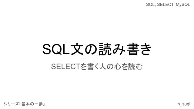 m_company_user user-- 社員テーブル LEFT JOIN m_organization org -- 組織テーブル ON org.company_id = user.company_id AND org.organization_id = user.organization1_id AND org.del_flg = '0' WHERE user.company_id = 2 AND user.del_flg = '0' GROUP BY union_index, organization_name HAVING COUNT(user.user_id) >= 4 -- この条件の効果は? -- UNION ALL -- 右上へ続く... -- ...左下からの続き SELECT 2 AS union_index ,'削除済の社員' , COUNT(v.user_name) FROM (SELECT DISTINCT u.user_name -- DISTINCTを使う理由は? FROM m_company_user u WHERE u.company_id = 2 AND u.del_flg = '1' ) v -- ORDER BY union_index ,user_count DESC 読んでみよう