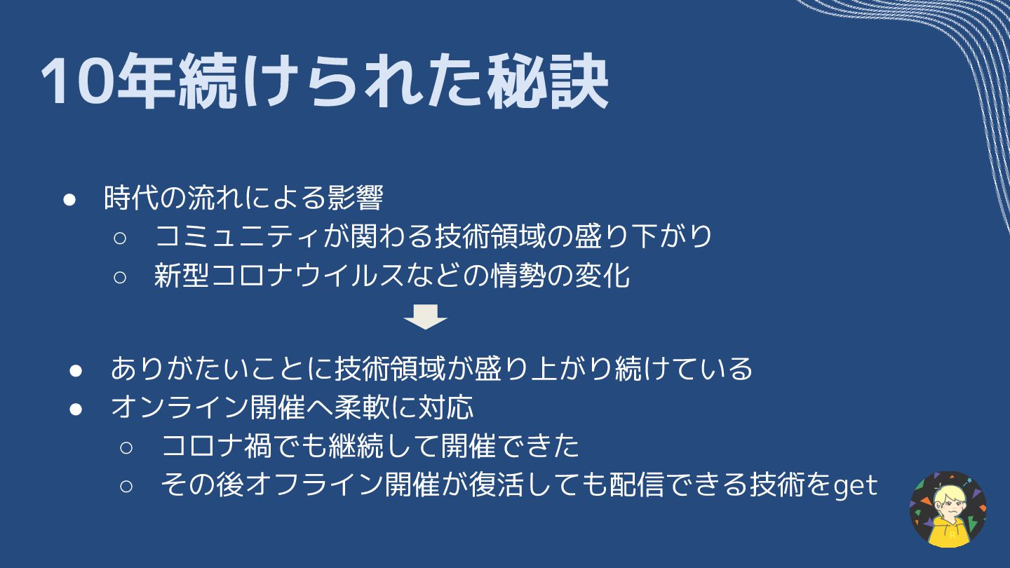 • 8年目:Swift愛好会がWWDC公式から紹介される • 9年目:初代運営メンバー(登壇者のjollyjoesterを含む)が運営から 引退する • 10年目:初代のメンバーがいなくなった後も、変わらずほぼ毎月の 勉強会を開催しながら活動している