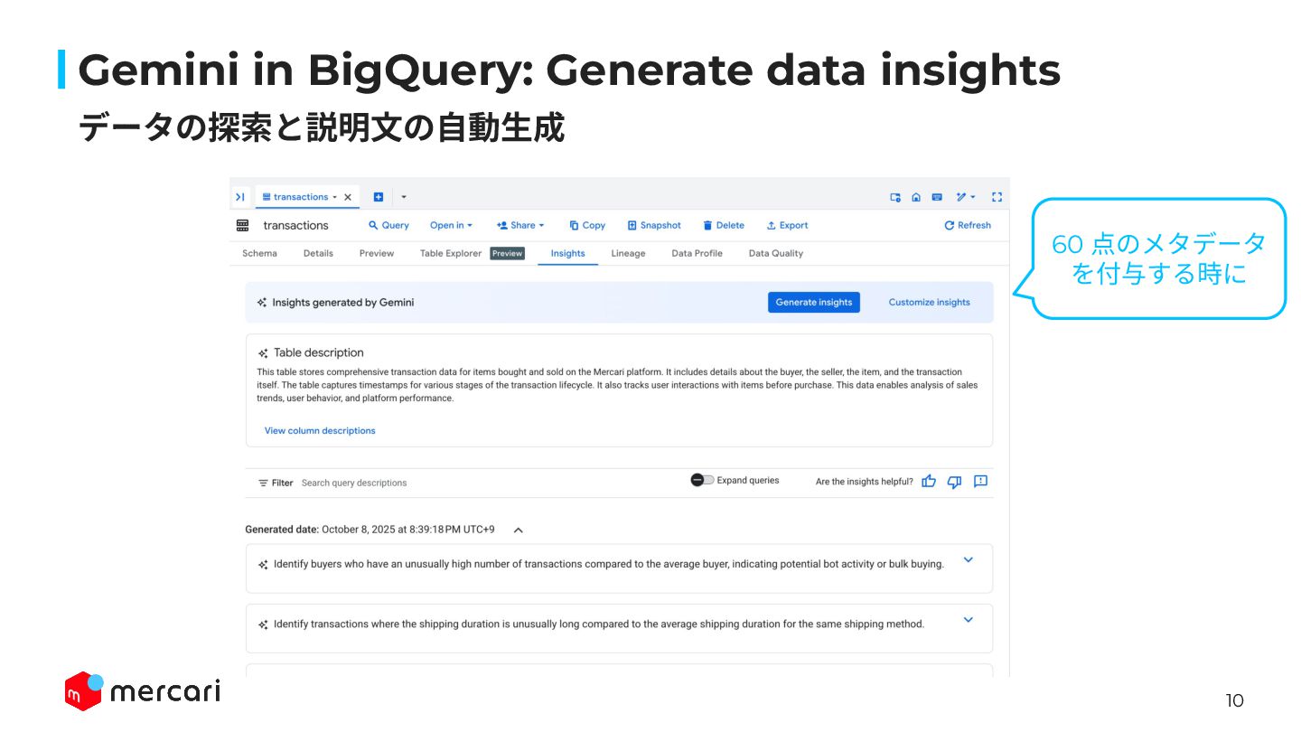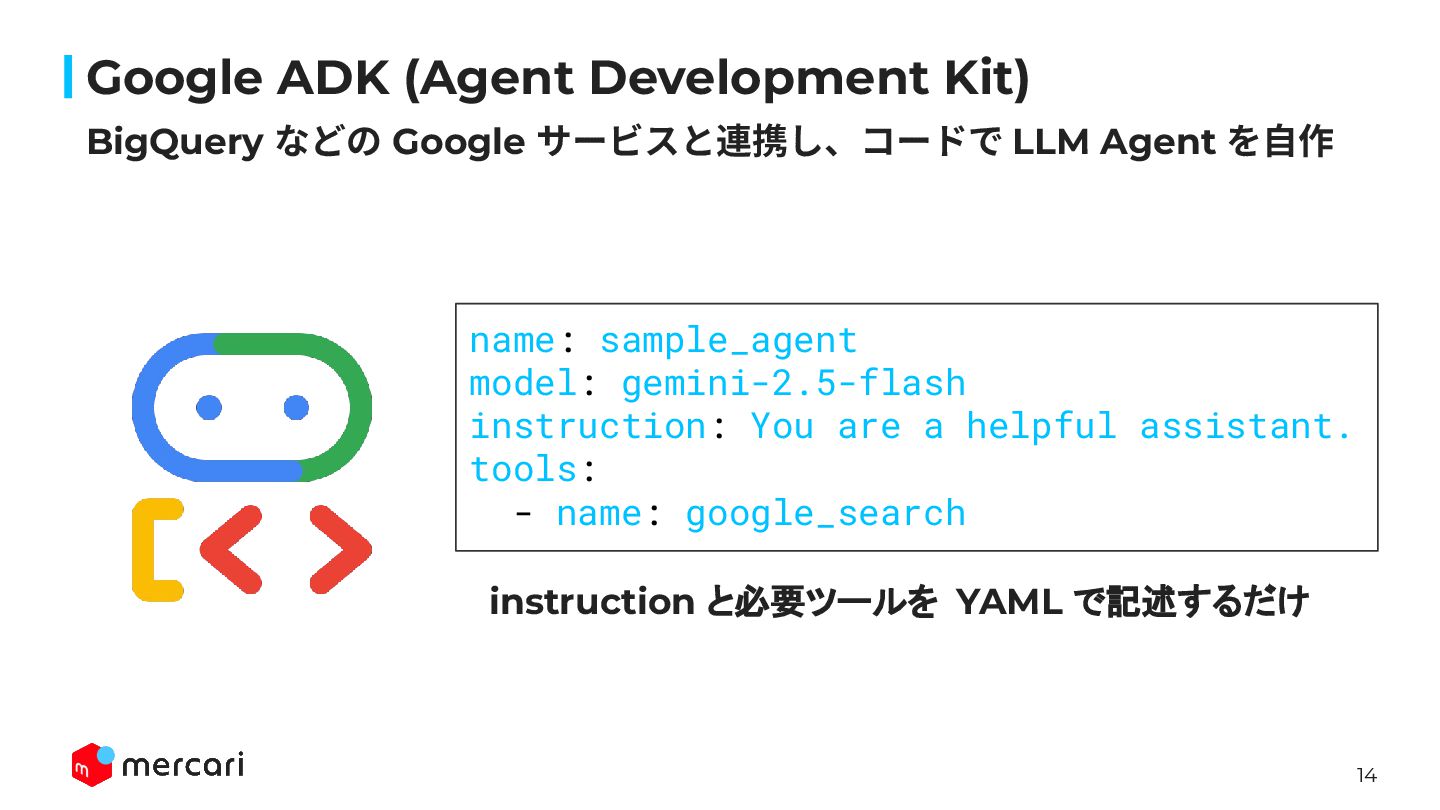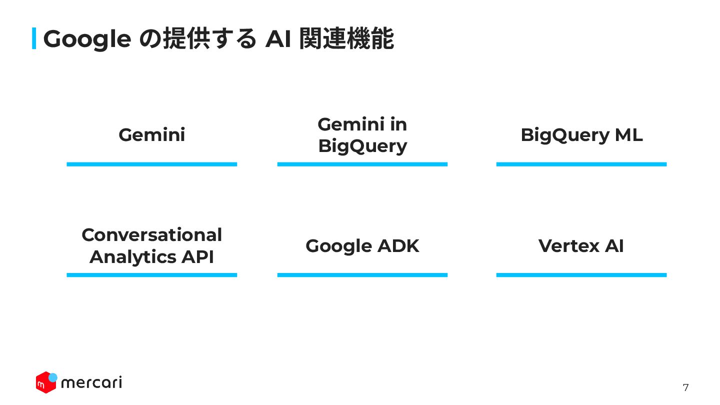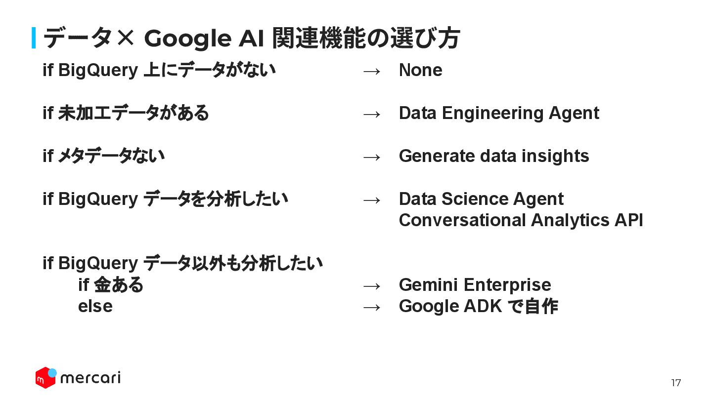 Engineering Agent if メタデータない → Generate data insights if BigQuery データを分析したい → Data Science Agent Conversational Analytics API if BigQuery データ以外も分析したい if 金ある → Gemini Enterprise else → Google ADK で自作 データ× Google AI 関連機能の選び⽅