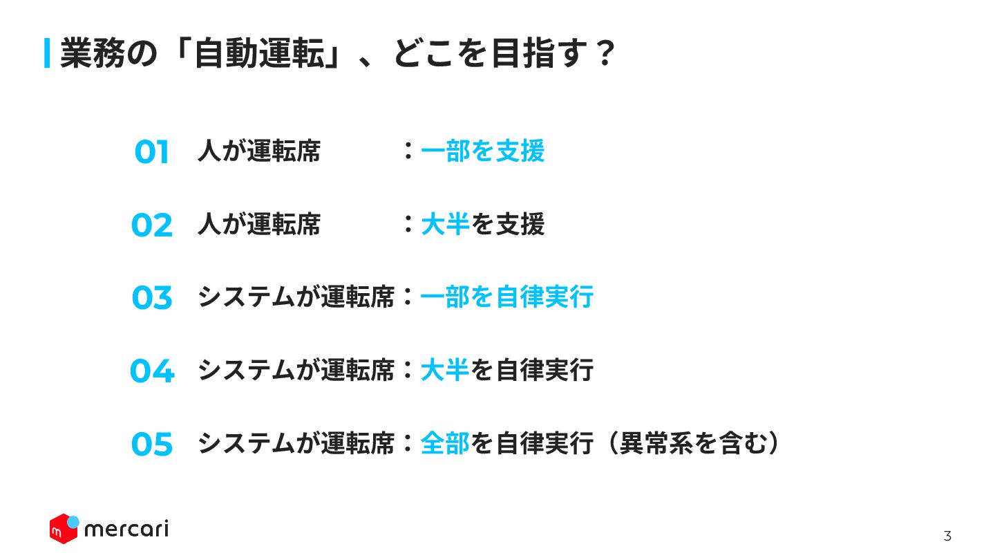 3 ⼈が運転席 :⼀部を⽀援 業務の「⾃動運転」、どこを⽬指す? ⼈が運転席 :⼤半を⽀援 システムが運転席:⼀部を⾃律実⾏ システムが運転席:⼤半を⾃律実⾏ 02 03