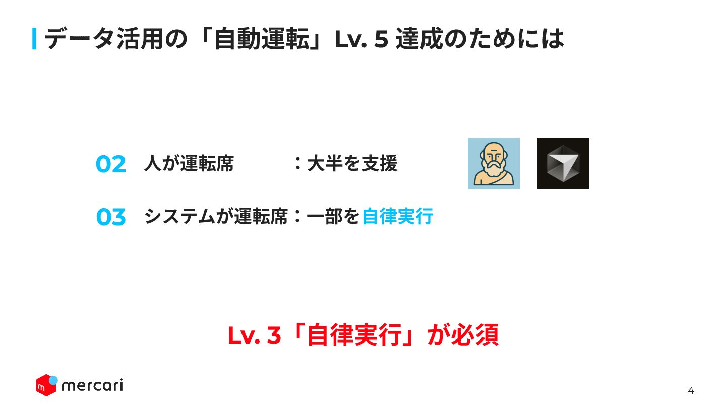 4 データ活⽤の「⾃動運転」Lv. 5 達成のためには ⼈が運転席 :⼤半を⽀援 システムが運転席:⼀部を⾃律実⾏ 02 03 Lv.