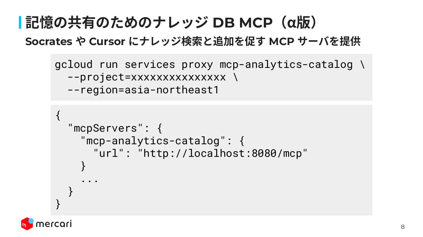 gcloud run services proxy mcp-analytics-catalog \ --project=xxxxxxxxxxxxxxx \ --region=asia-northeast1 { "mcpServers": { "mcp-analytics-catalog": { "url": "http://localhost:8080/mcp" } ... } }