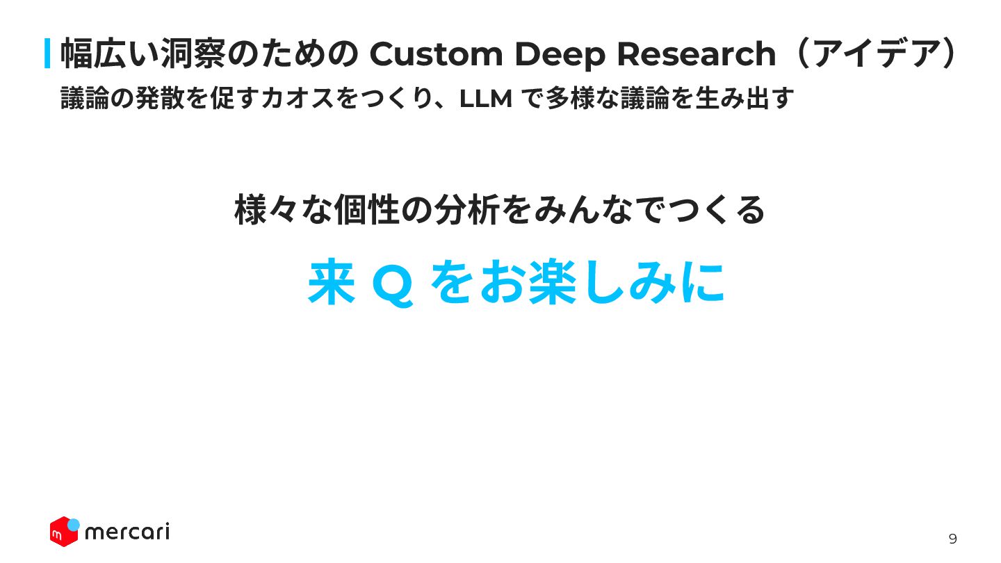 9 様々な個性の分析をみんなでつくる 幅広い洞察のための Custom Deep Research(アイデア) 来 Q をお楽しみに 議論の発散を促すカオスをつくり、LLM