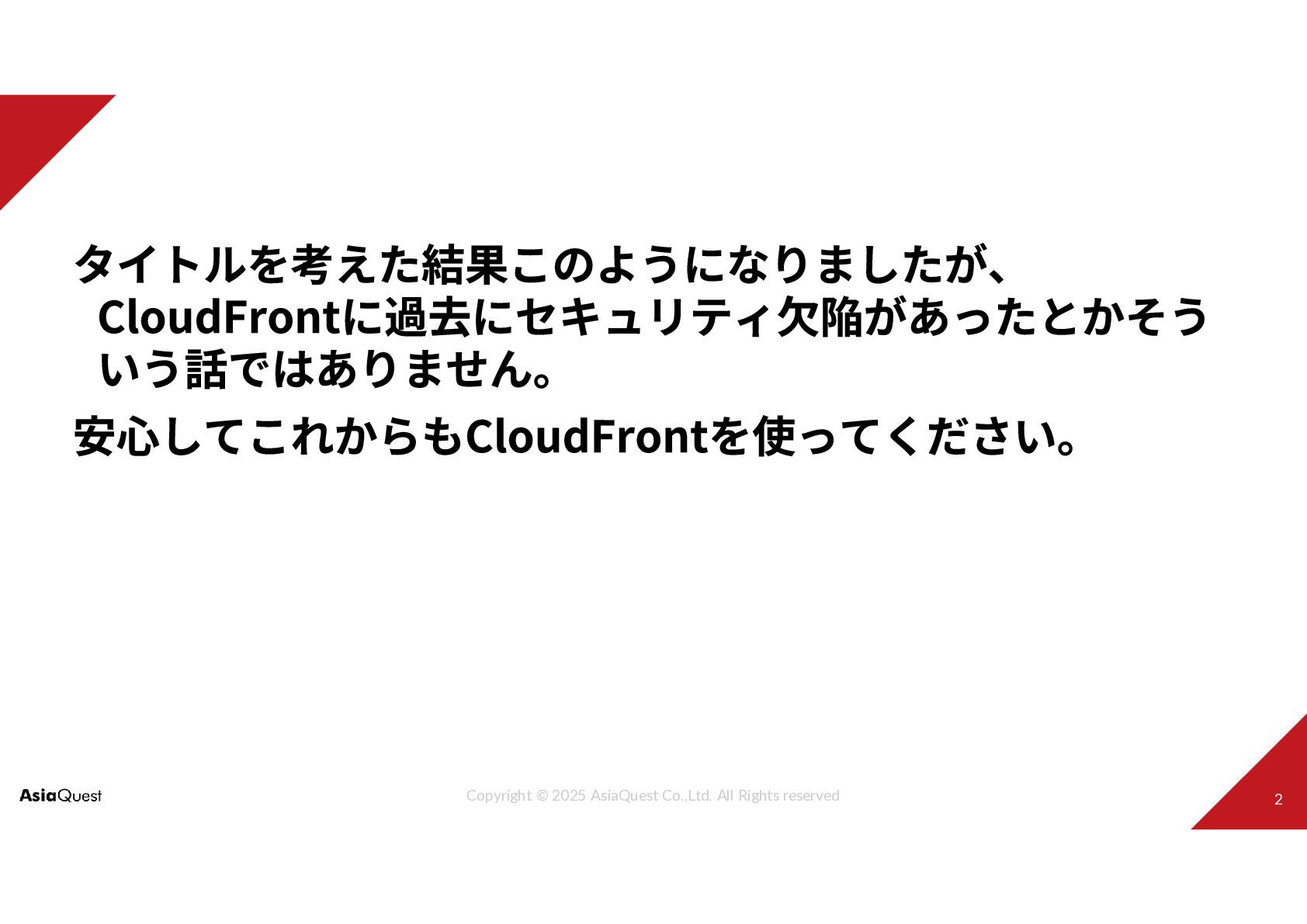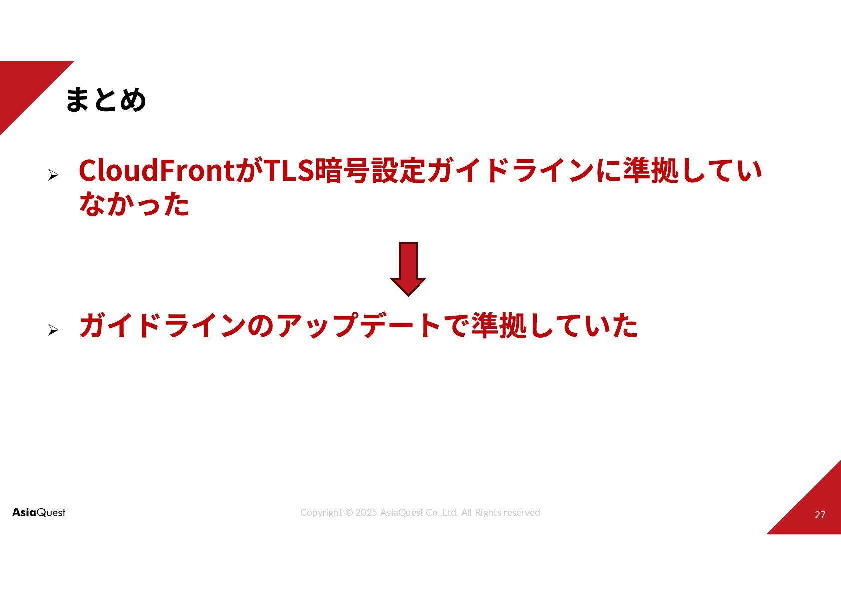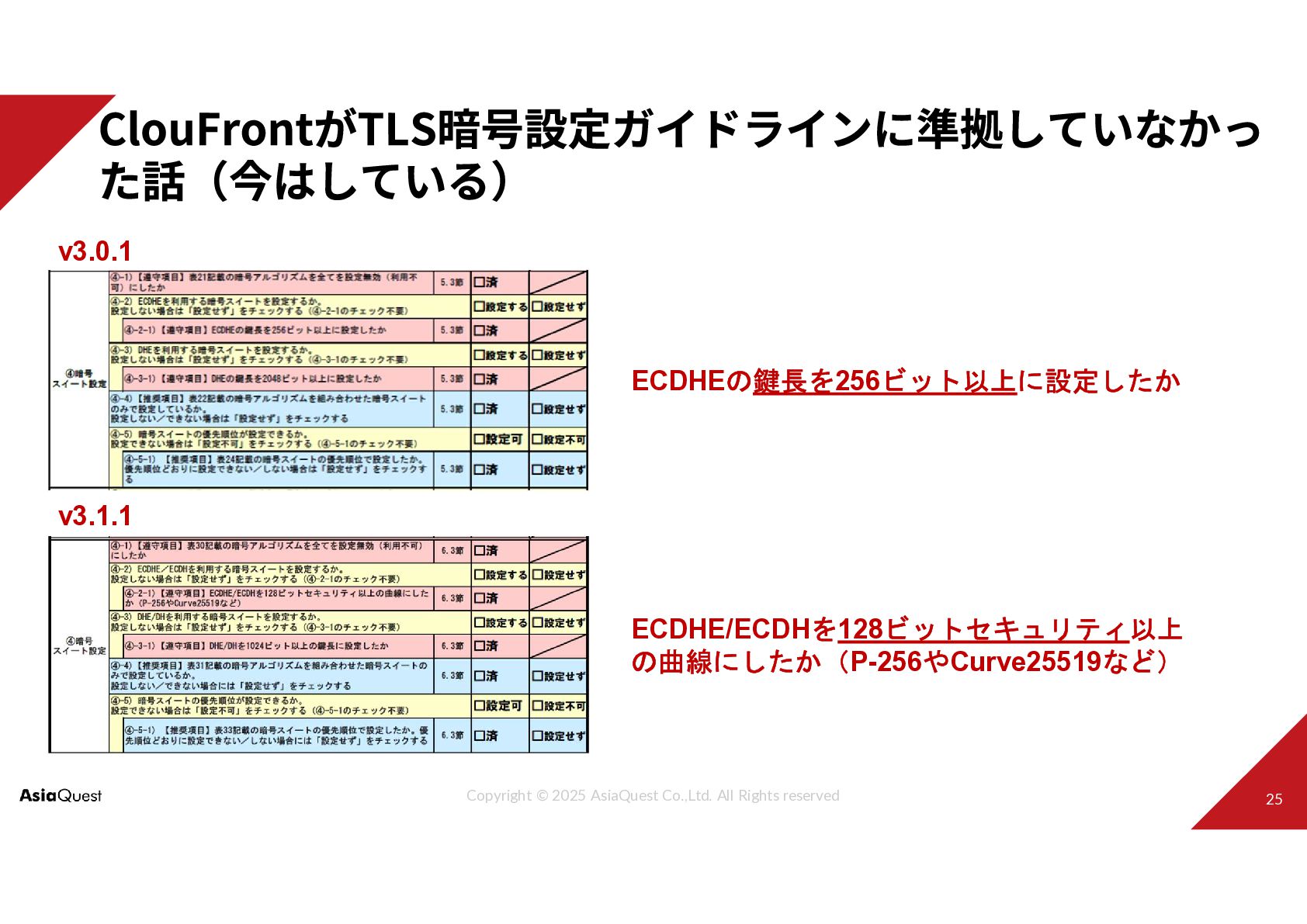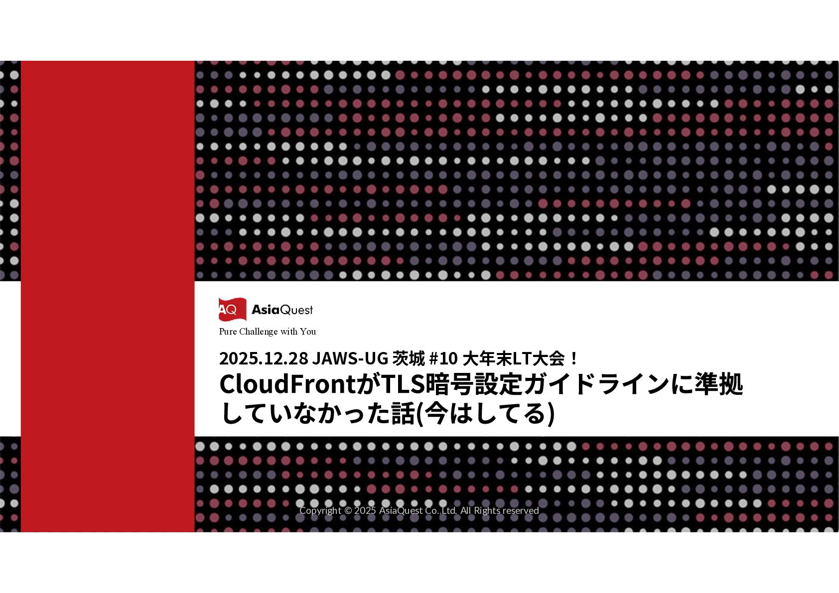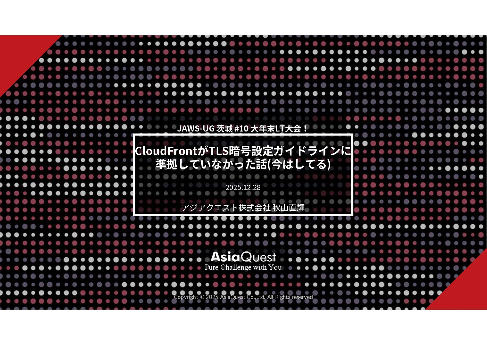 Challenge with You Copyright © 2025 AsiaQuest Co.,Ltd. All Rights reserved JAWS-UG 茨城 #10 大年末LT大会! CloudFrontがTLS暗号設定ガイドラインに 準拠していなかった話(今はしてる) 2025.12.28 アジアクエスト株式会社 秋山直輝