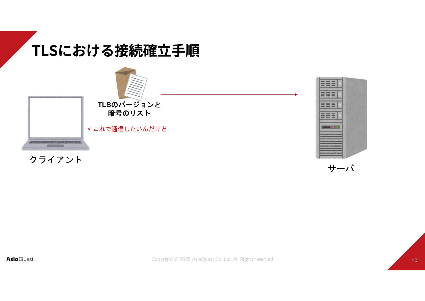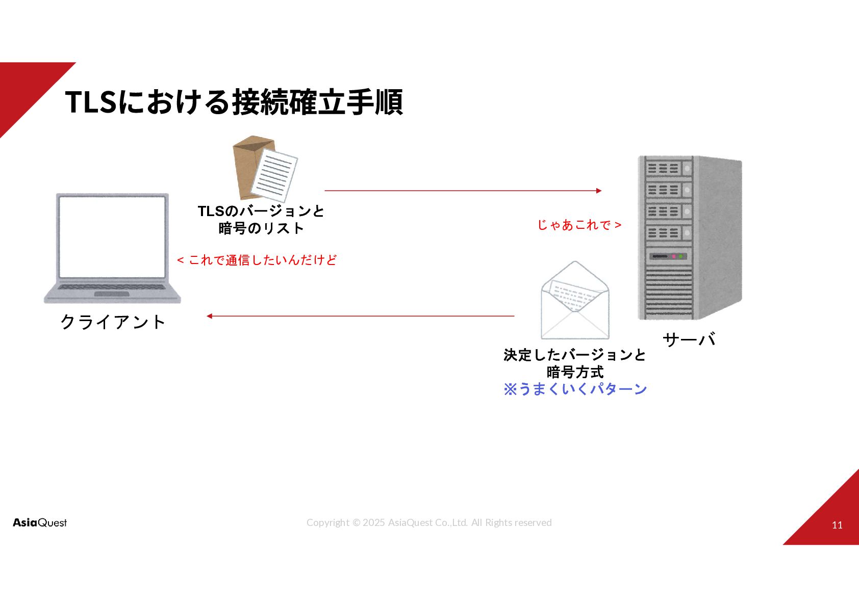 クライアント サーバ TLSのバージョンと 暗号のリスト < これで通信したいんだけど 決定したバージョンと 暗号方式 ※うまくいくパターン じゃあこれで >