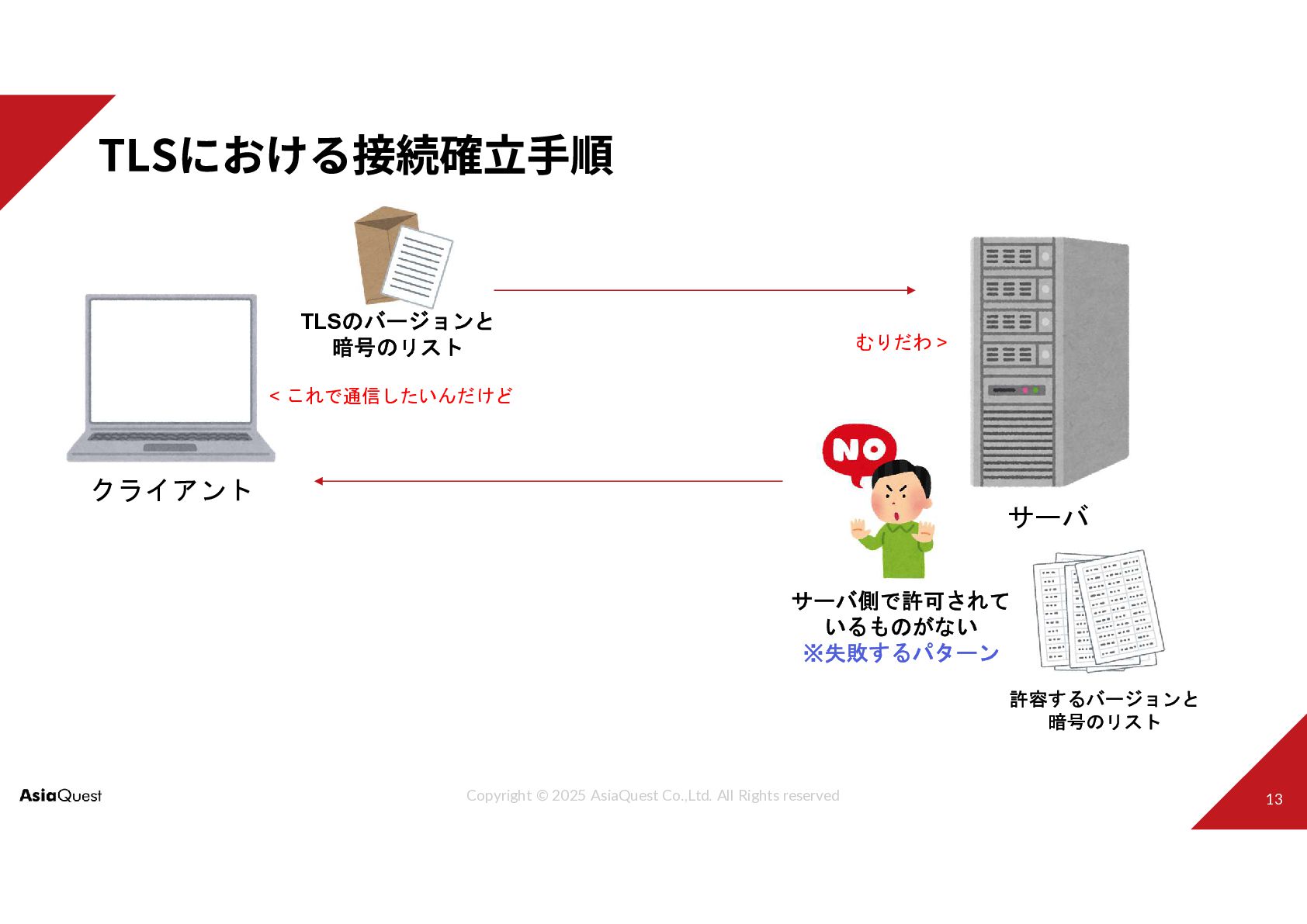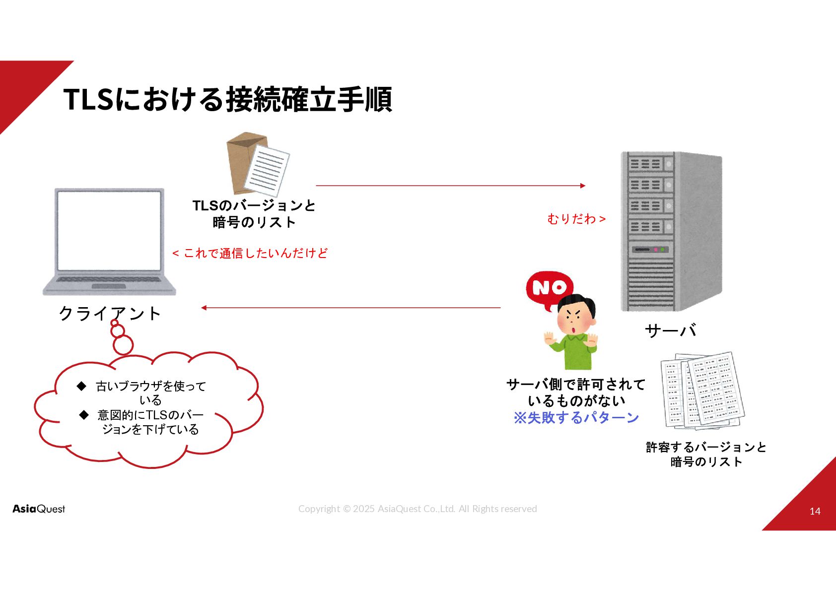 クライアント サーバ TLSのバージョンと 暗号のリスト < これで通信したいんだけど むりだわ > 許容するバージョンと 暗号のリスト サーバ側で許可されて いるものがない ※失敗するパターン