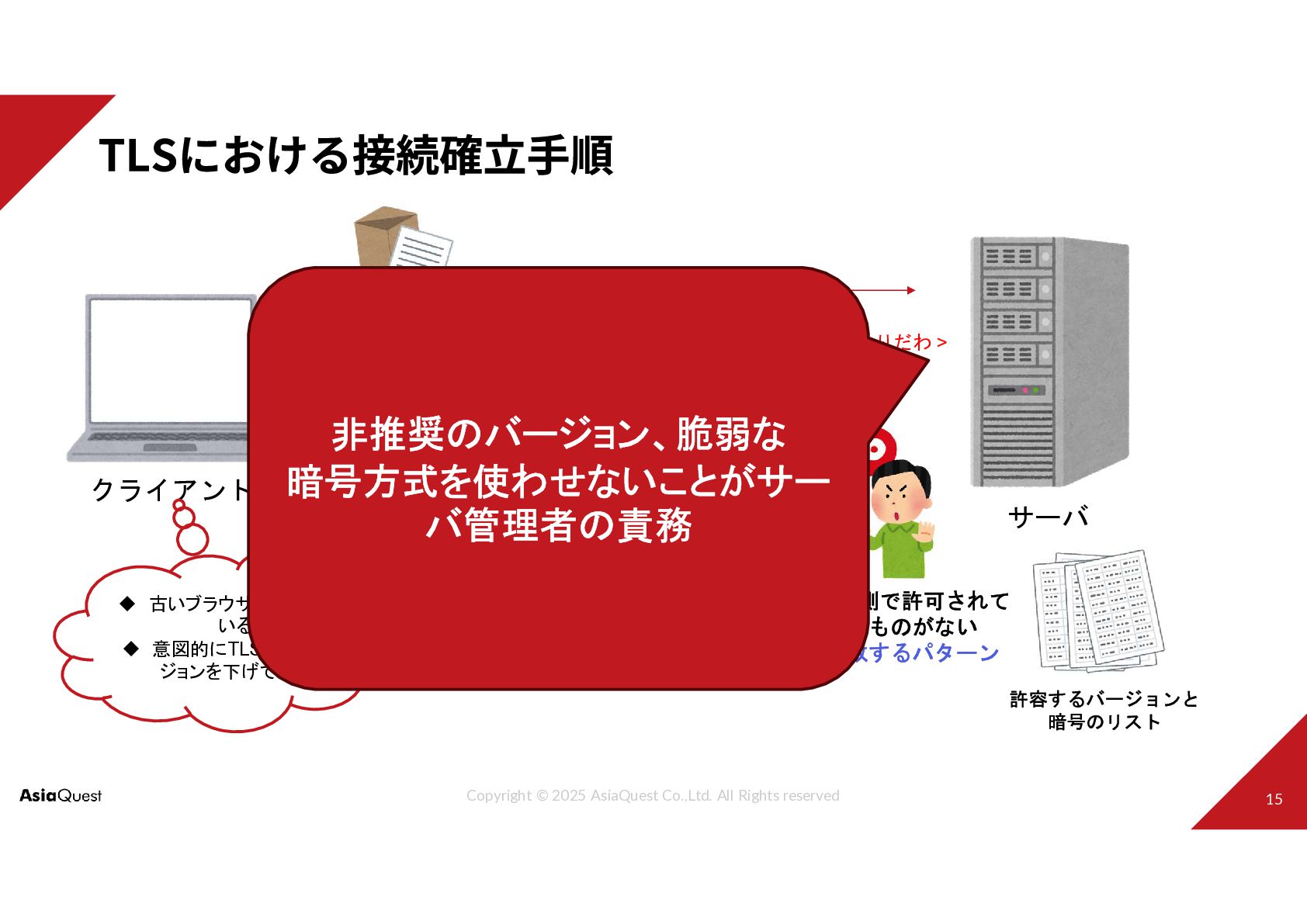 クライアント サーバ TLSのバージョンと 暗号のリスト < これで通信したいんだけど むりだわ > 許容するバージョンと 暗号のリスト 古いブラウザを使って いる 意図的にTLSのバー ジョンを下げている サーバ側で許可されて いるものがない ※失敗するパターン 非推奨のバージョン、脆弱な 暗号方式を使わせないことがサー バ管理者の責務