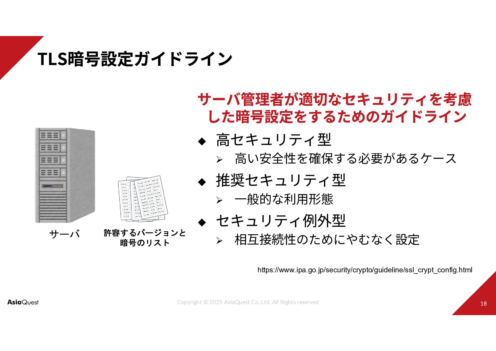 高い安全性を確保する必要があるケース 一般的な利用形態 相互接続性のためにやむなく設定 サーバ 許容するバージョンと 暗号のリスト https://www.ipa.go.jp/security/crypto/guideline/ssl_crypt_config.html