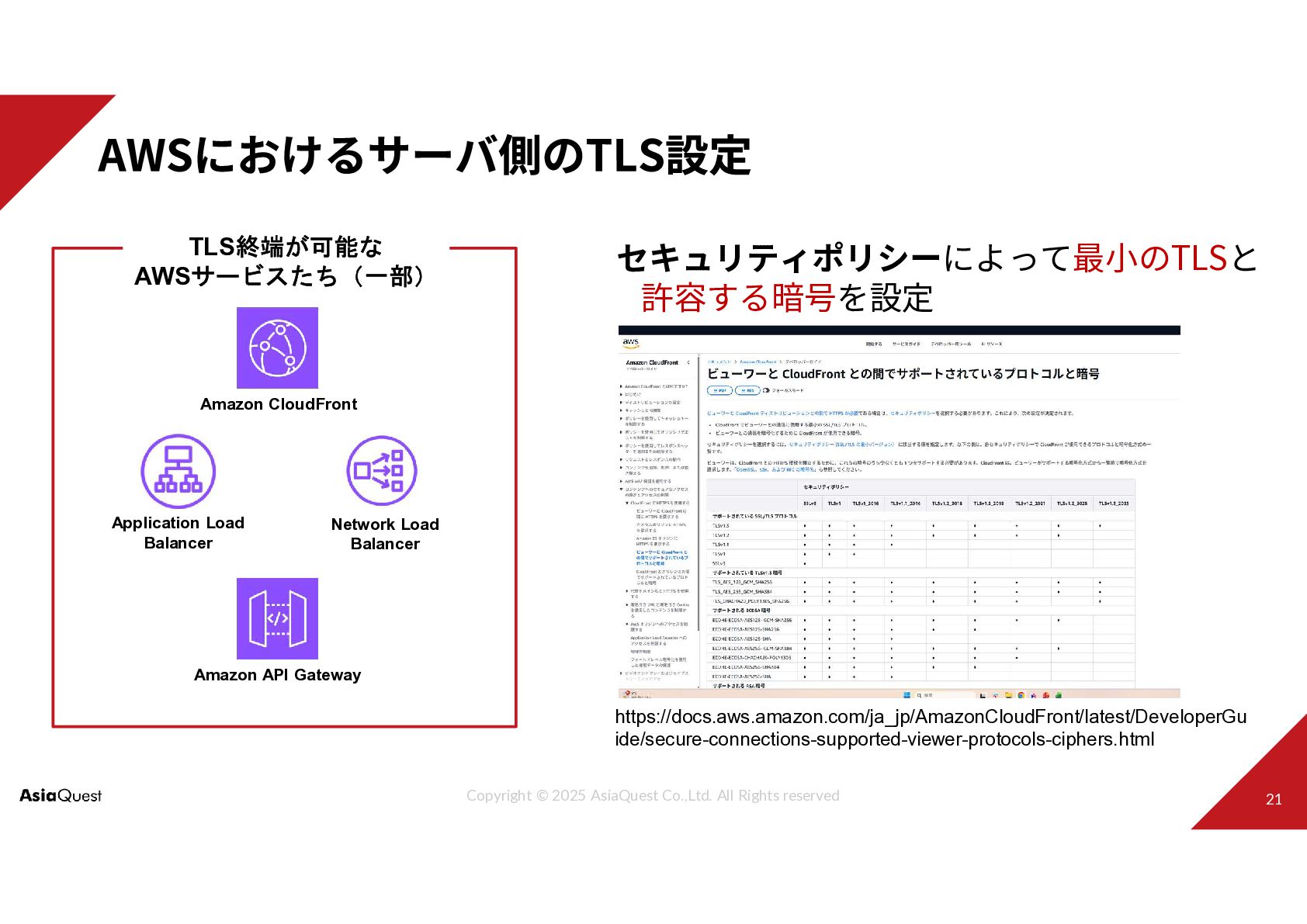 セキュリティポリシーによって最小のTLSと 許容する暗号を設定 Amazon CloudFront Application Load Balancer Network Load Balancer Amazon API Gateway TLS終端が可能な AWSサービスたち(一部) https://docs.aws.amazon.com/ja_jp/AmazonCloudFront/latest/DeveloperGu ide/secure-connections-supported-viewer-protocols-ciphers.html