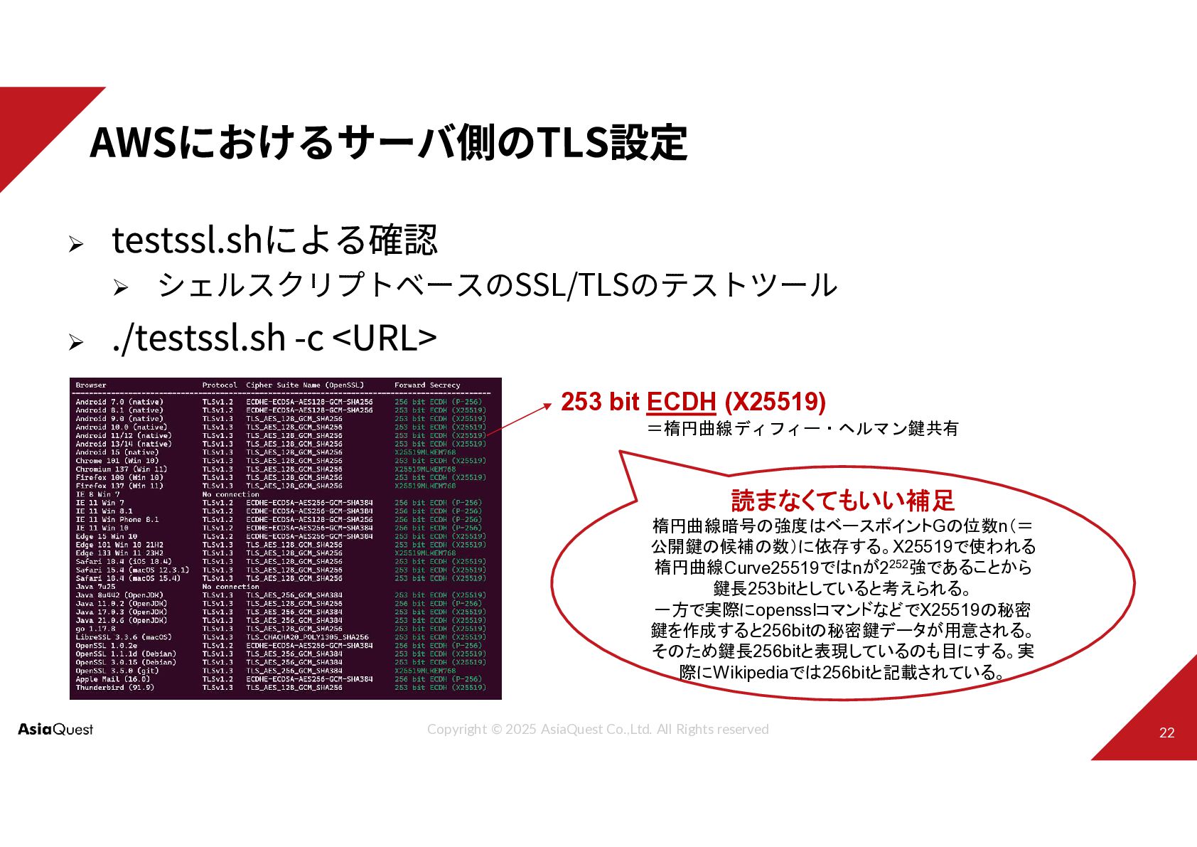 シェルスクリプトベースのSSL/TLSのテストツール 253 bit ECDH (X25519) =楕円曲線ディフィー・ヘルマン鍵共有 読まなくてもいい補足 楕円曲線暗号の強度はベースポイントGの位数n(= 公開鍵の候補の数)に依存する。X25519で使われる 楕円曲線Curve25519ではnが2252強であることから 鍵長253bitとしていると考えられる。 一方で実際にopensslコマンドなどでX25519の秘密 鍵を作成すると256bitの秘密鍵データが用意される。 そのため鍵長256bitと表現しているのも目にする。実 際にWikipediaでは256bitと記載されている。