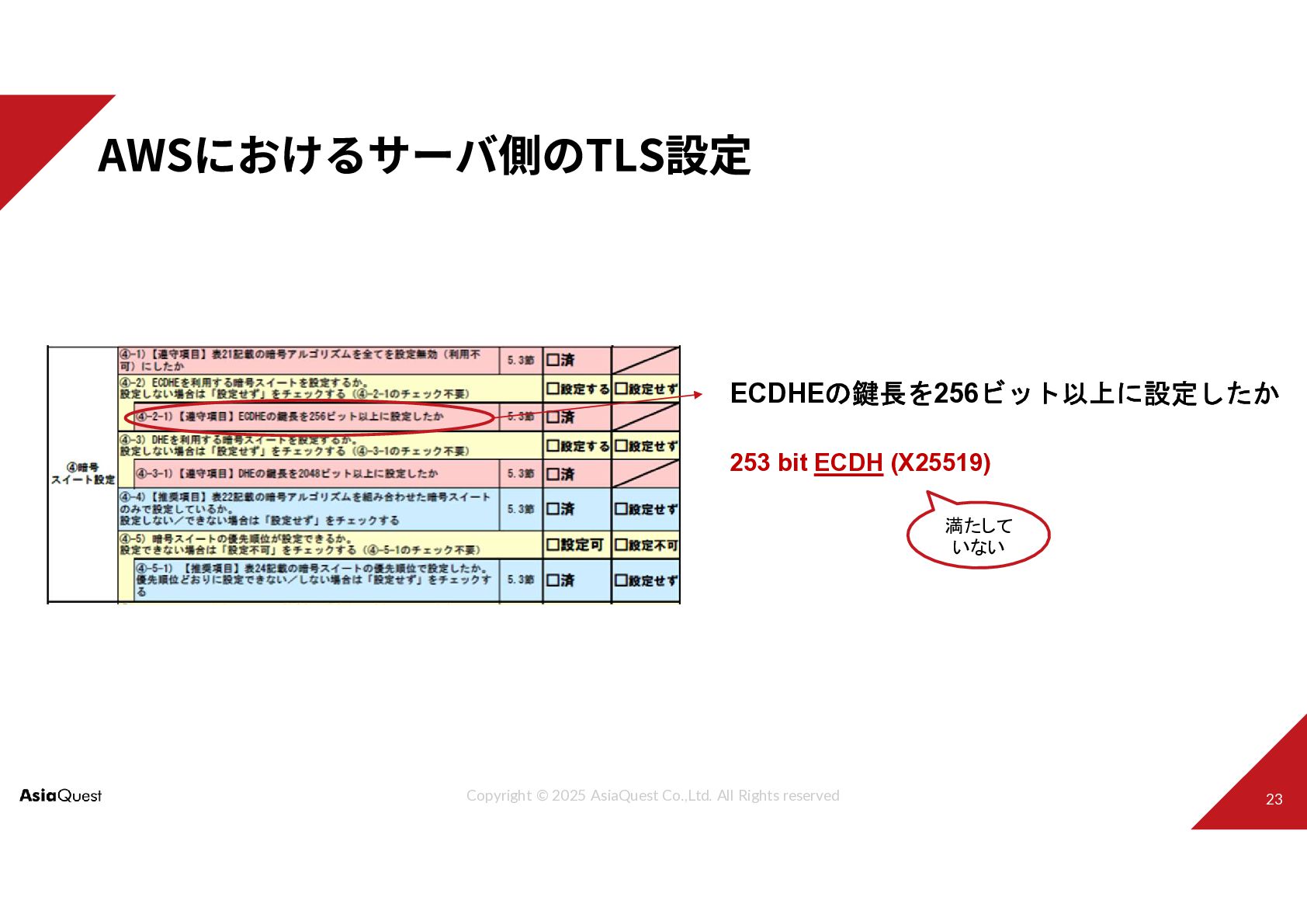 253 bit ECDH (X25519) ECDHEの鍵長を256ビット以上に設定したか 満たして いない